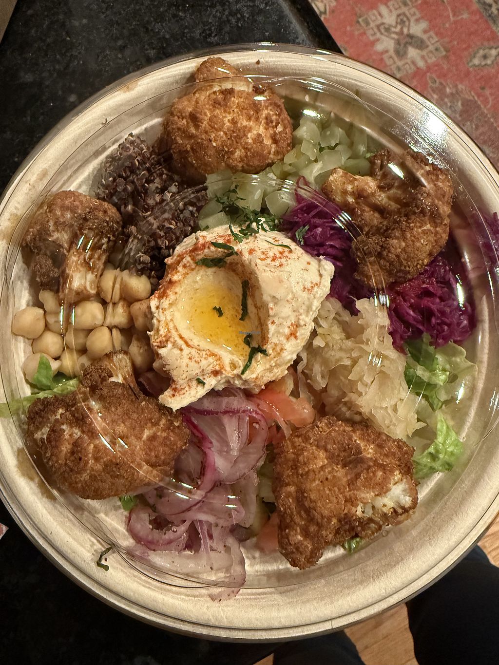 The food here is delicious! We had the falafel pita, middle eastern salad with cauliflower, hummus bowl and fattoush salad. Everything was so good! And it's great to finally have an all vegetarian restaurant in Stowe