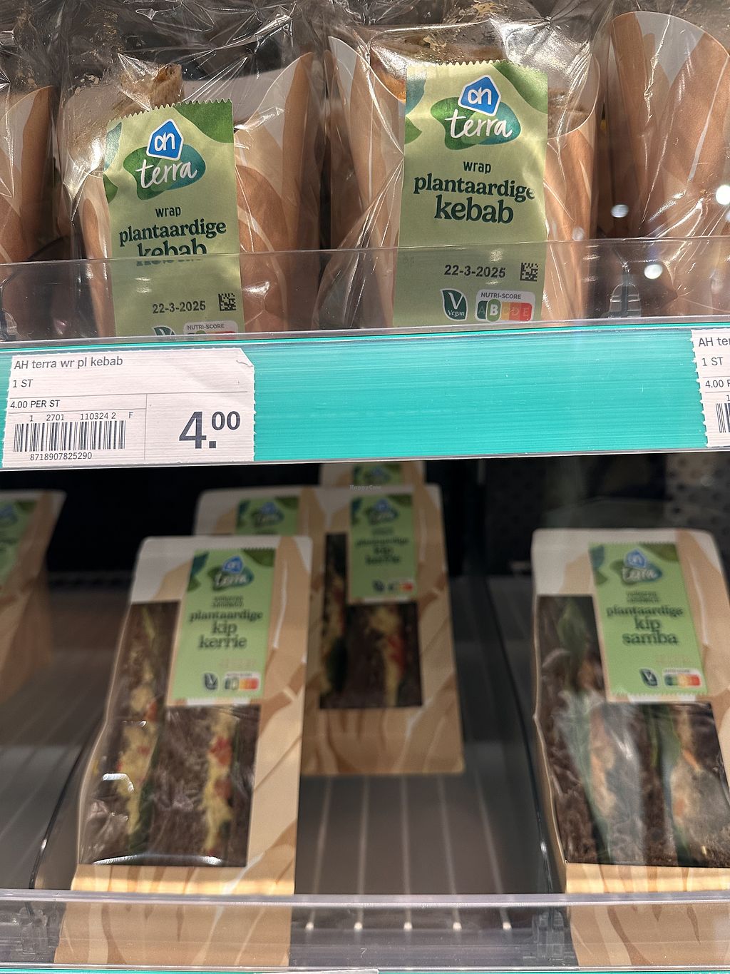 Offers a lot of vegan products such us salads, wraps, cheese, plant milks & yogurts, vegan ice cream (see photos), smoothies, vegan baked goods & more. You can find an Albert Heijn supermarket everywhere in Amsterdam.