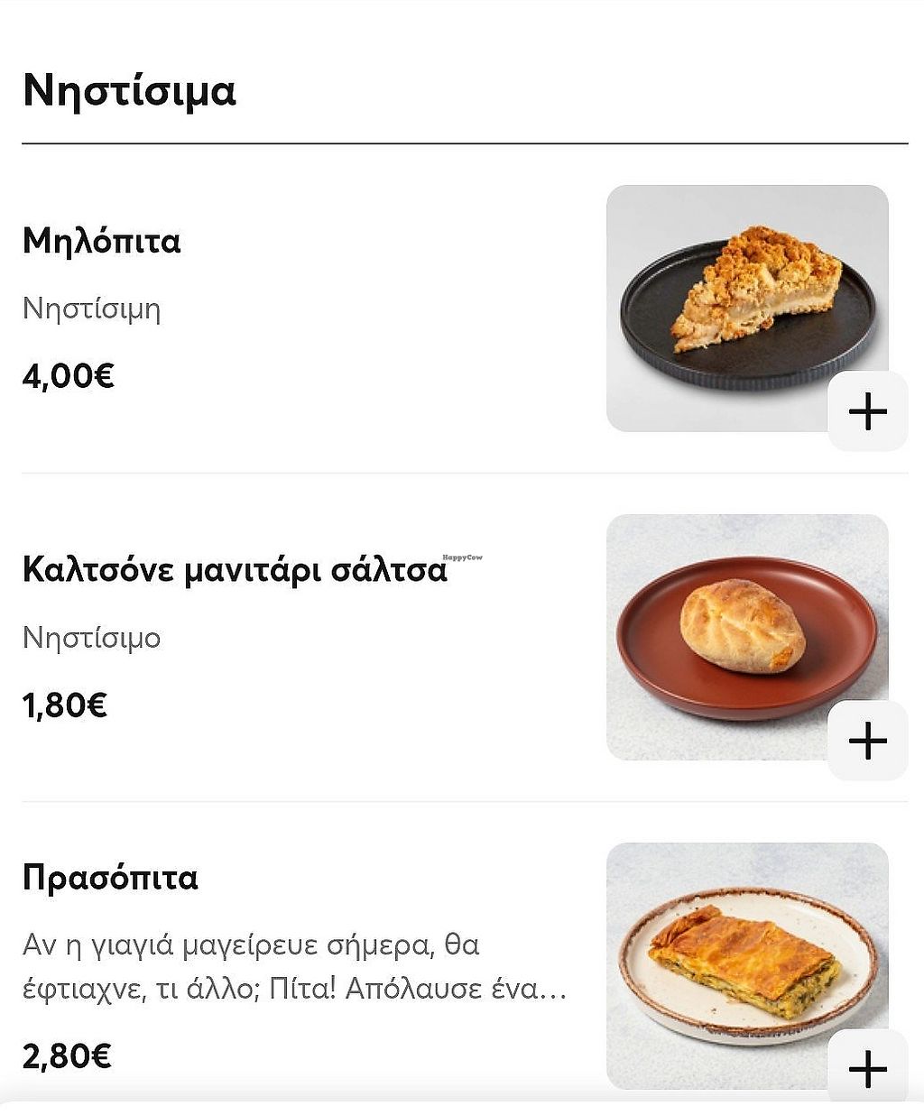 Vegan options as seen on efood delivery app: apple pie, canzone with m…