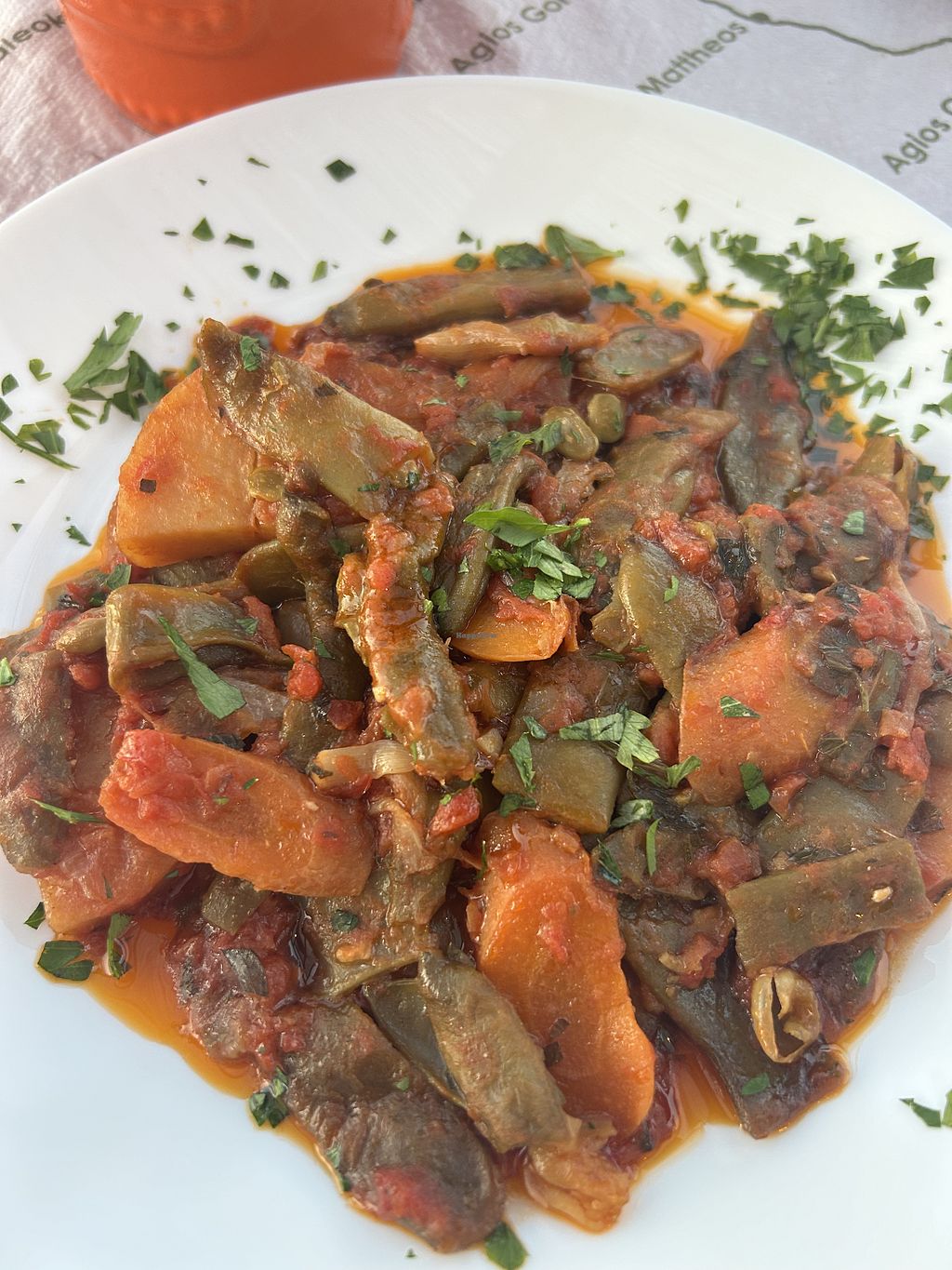 Serves meat, vegan options available. Greek restaurant in Roda village with vegan choices such as a vegan burger, fasolakia (green beans & potatoes cooked in a light tomato red sauce), lahanorizo (Greek cabbage & rice), and briam (Greek mixed vegatables cooked slowly in a garlic, herb, olive oil & tomato sauce). Open Mon 9:00am-2:00am, Tue-Thu 9:00am-3:00am, Fri-Sun 9:00am-2:00am.