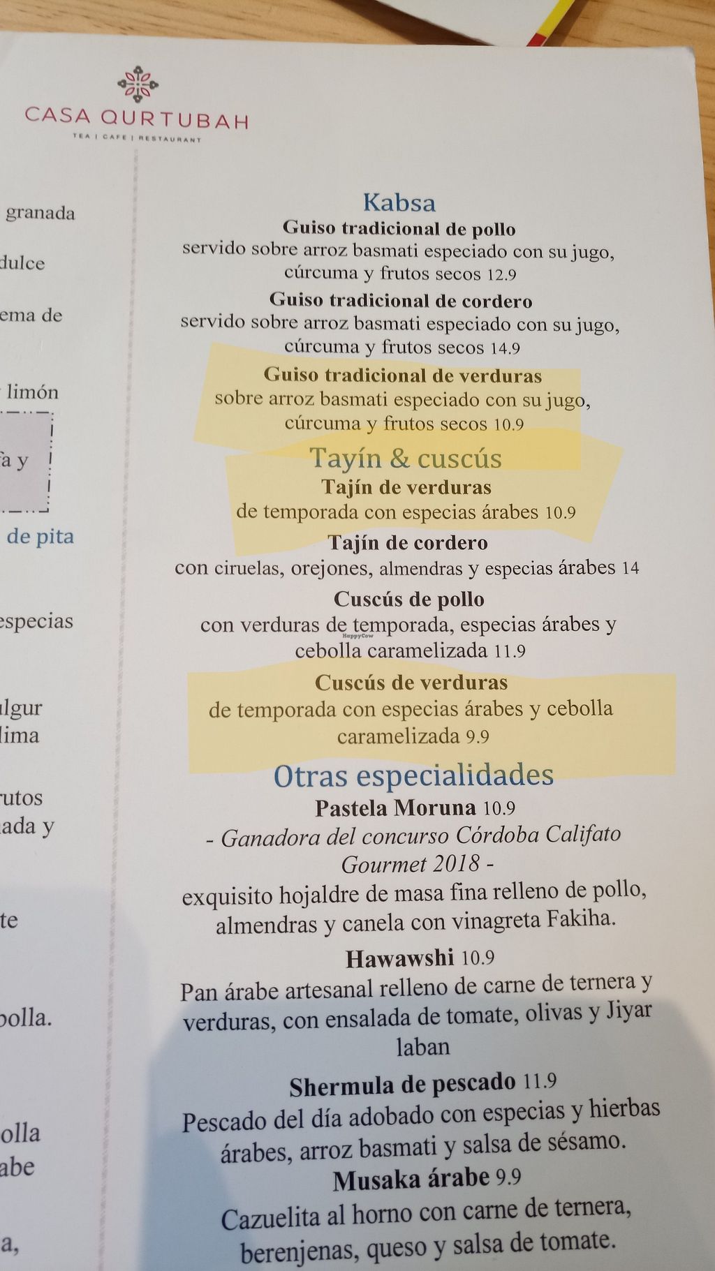 Carta, con al menos 3 opciones principales veganas