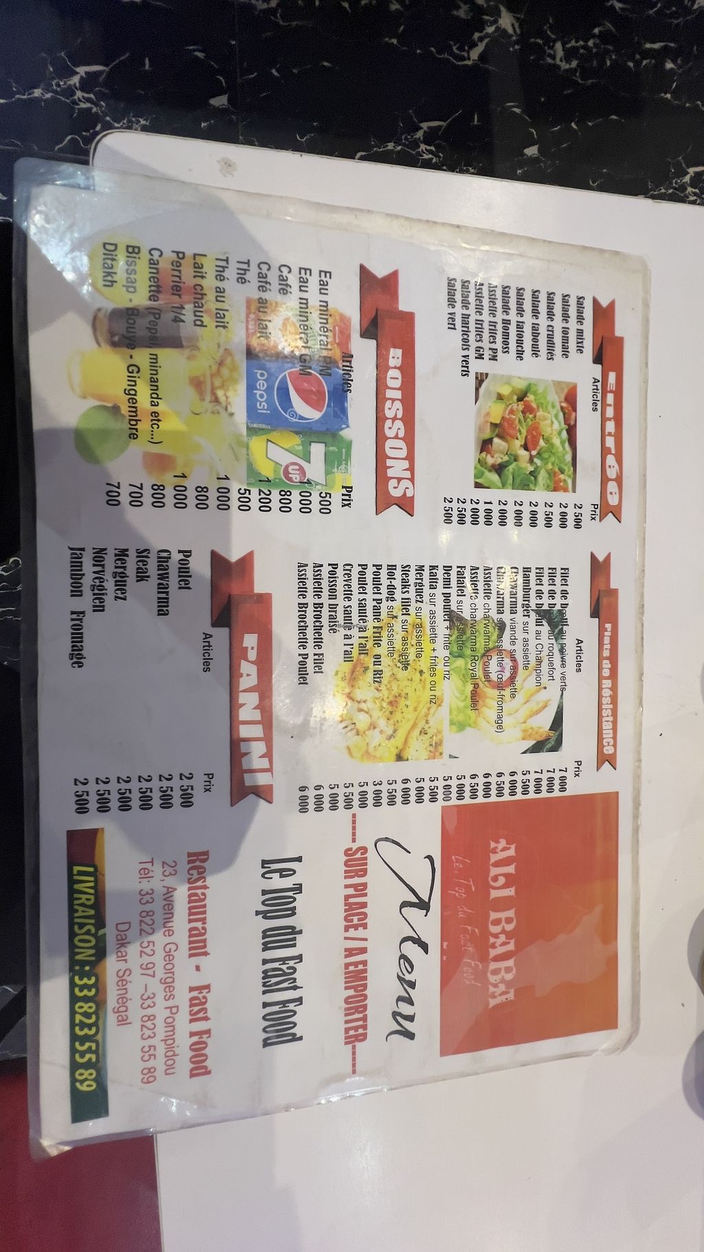 This restaurant is easy to find with Google Maps (you can't miss it, it's pretty big). It has lots of seating inside and also does takeaway. The interior is a bit dark and gloomy and it has a TV playing sports. It's definitely a "no frills" place. The staff seem to speak French but not English. They said the sauce in the falafel wrap is only tahini (they offer you mayo etc on the side after bringing you the wrap) so it's vegan. It was 1500cfa for the wrap so pretty cheap. It had falafel, salad, tahini and CHIPS inside!!! There are also various salads on the menu but I didn't have the energy to discuss if the dressing is vegan etc in French.