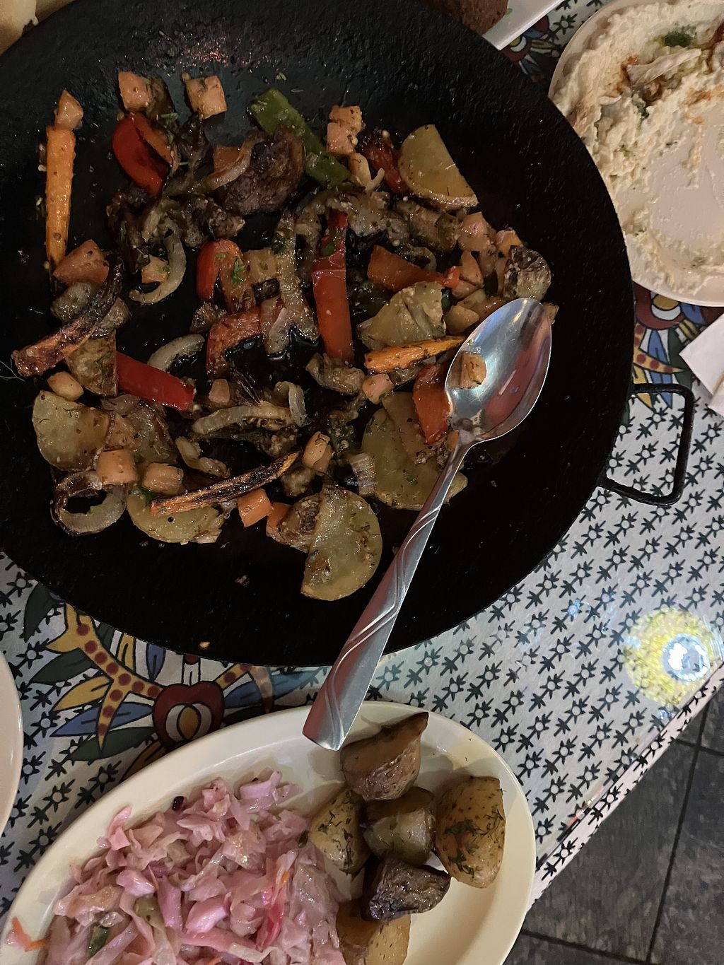 We shared 4 Falafel with pita bread (without joghurt dip). For dinner I had the vegetarian casserole without the potato salad. The vegetarian casserole is a bowl of vegetables with rice and cabbage-carrot salad. Extremely delicious and worth the price! They also have other vegan options labeled on the menu.