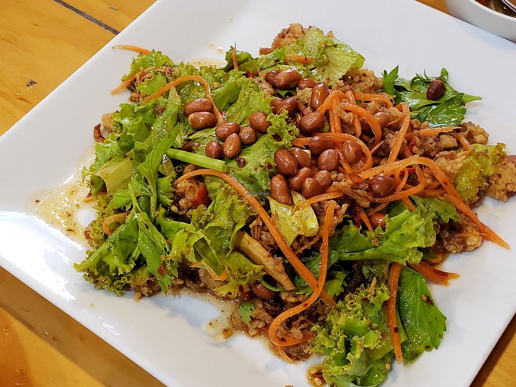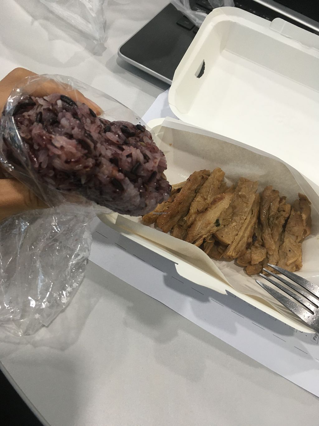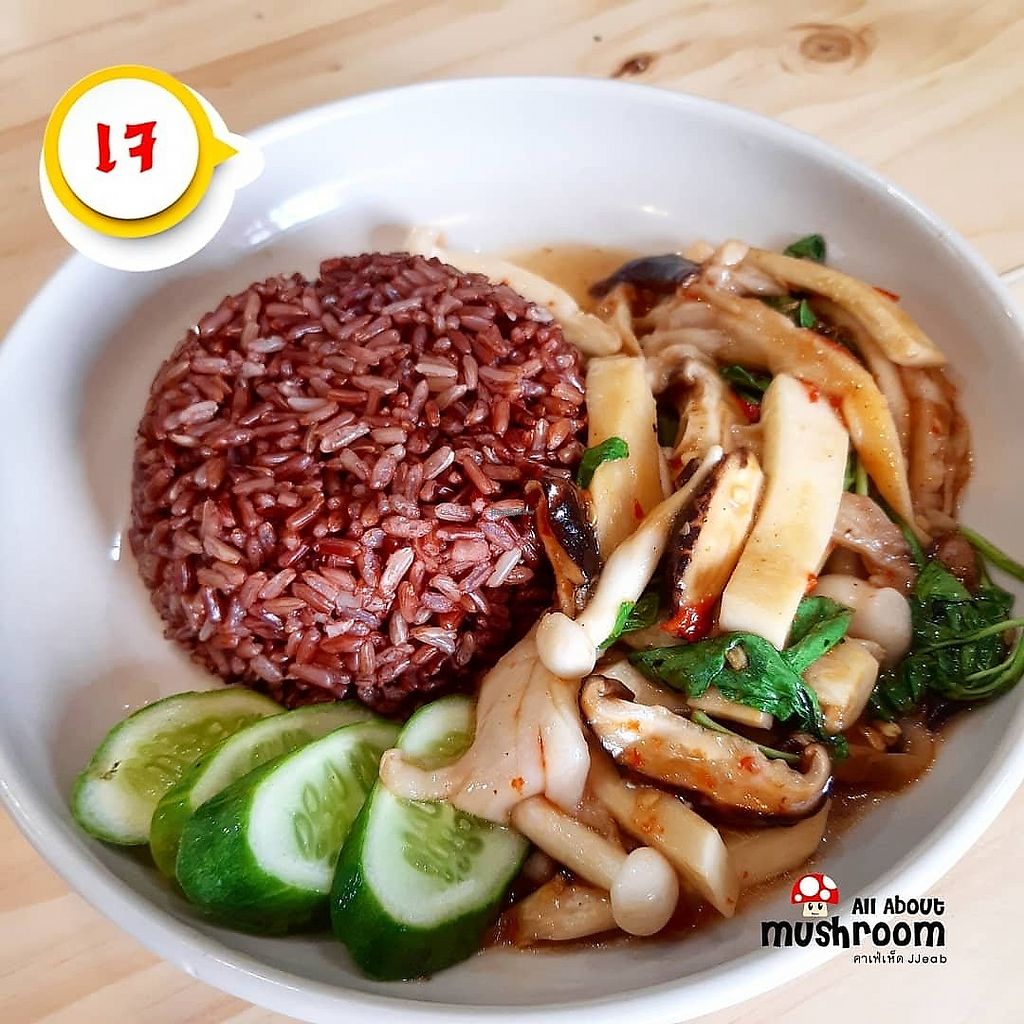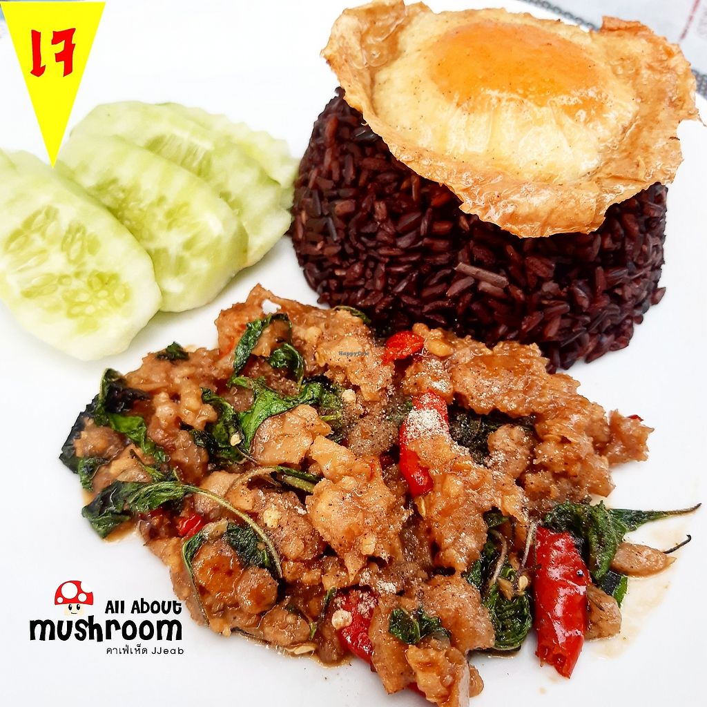 Omni mince stir fried with basil leaves top with vegan fried egg