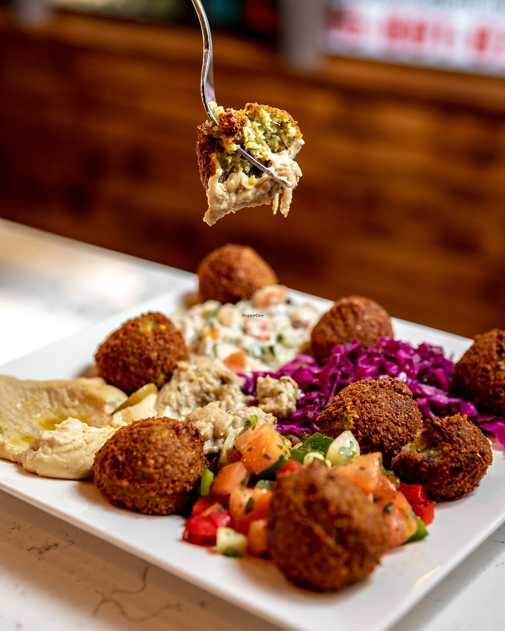 This website will not allow me to give this restaurant 5 stars because it is not fully vegan, but it does deserve 5 stars! There are at least 10+ salads to choose from, and the falafel is so delicious! Lots of vegetarian and vegan options, and the menu is marked as such. The staff is trained to point you in the right direction also! I love this spot, even the bar uses aquafaba instead of egg-whites as a vegan alternative for cool, fizzy drinks! 5 stars!