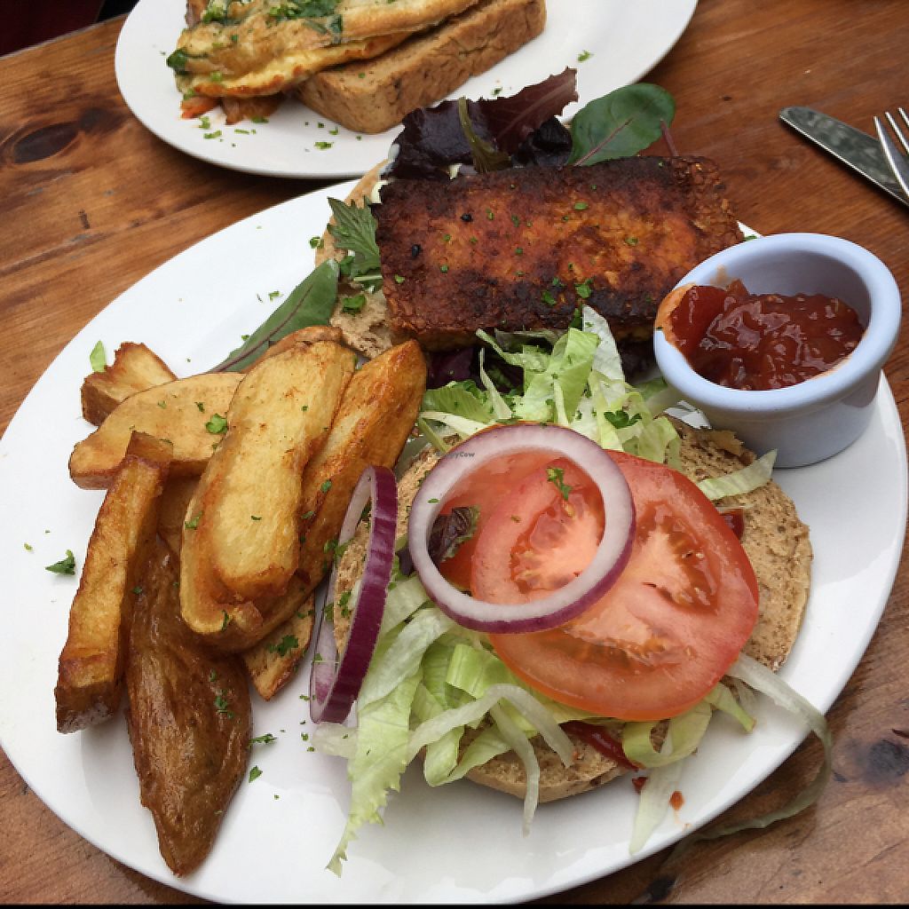 Vegan breakfast with scrambled tofu, sausage and bacon.