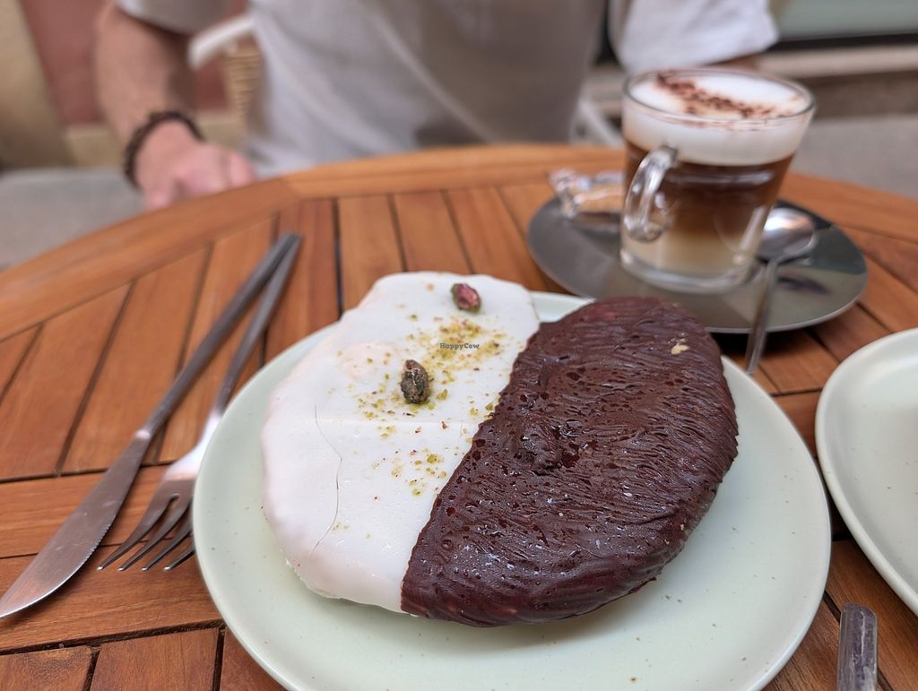 Matcha, tarta de zanahoria, zumo de naranja