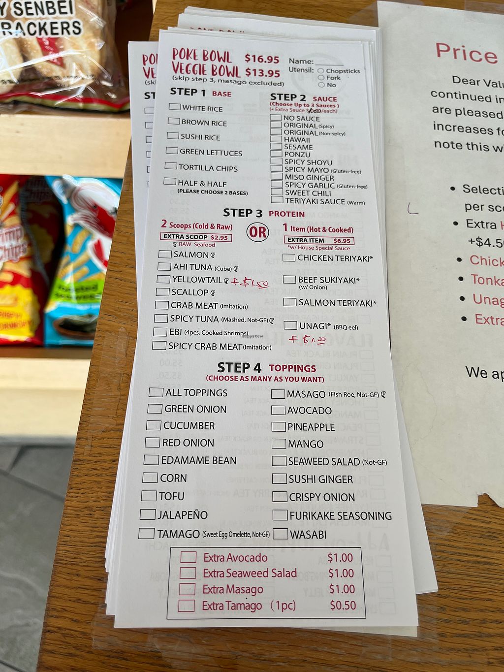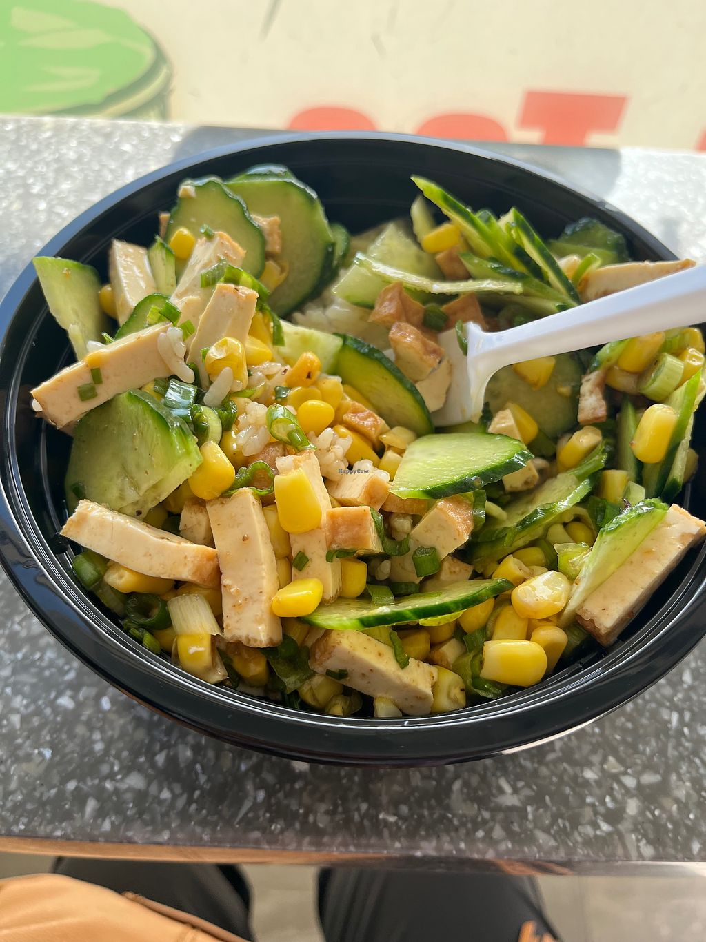 Sushi bowl with tofu, cucumbers, corn and original ginger dressing.