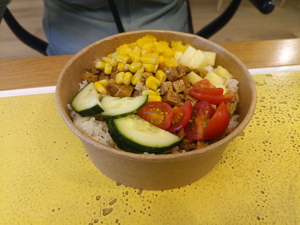 This place uses a build your own poke approach. There's a big list of items, vegan ones indicated, and you pick what you want. You get something nice at the end. It would be nice if they had more vegan options for protein.