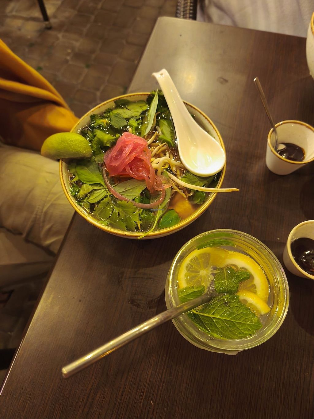 Vegan pho soup full of fresh herbs,bean sprouts,rice noodles and delic…
