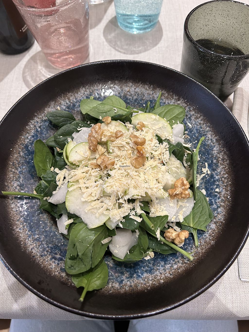 Antipasto: insalata con pera, daikon, noci e formaggio veg