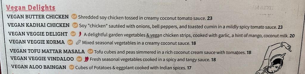 Serves meat, vegan options available. Indian restaurant with clearly labeled menu. Example vegan offerings include samosa, veggie delight, tofu matar masala, vindaloo and more. Open Mon-Sun 11:30am-2:30pm, Mon-Thu 4:00pm-9:00pm, Fri-Sat 4:00pm-9:30pm, Sun 4:00pm-9:00pm.