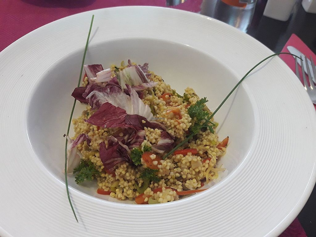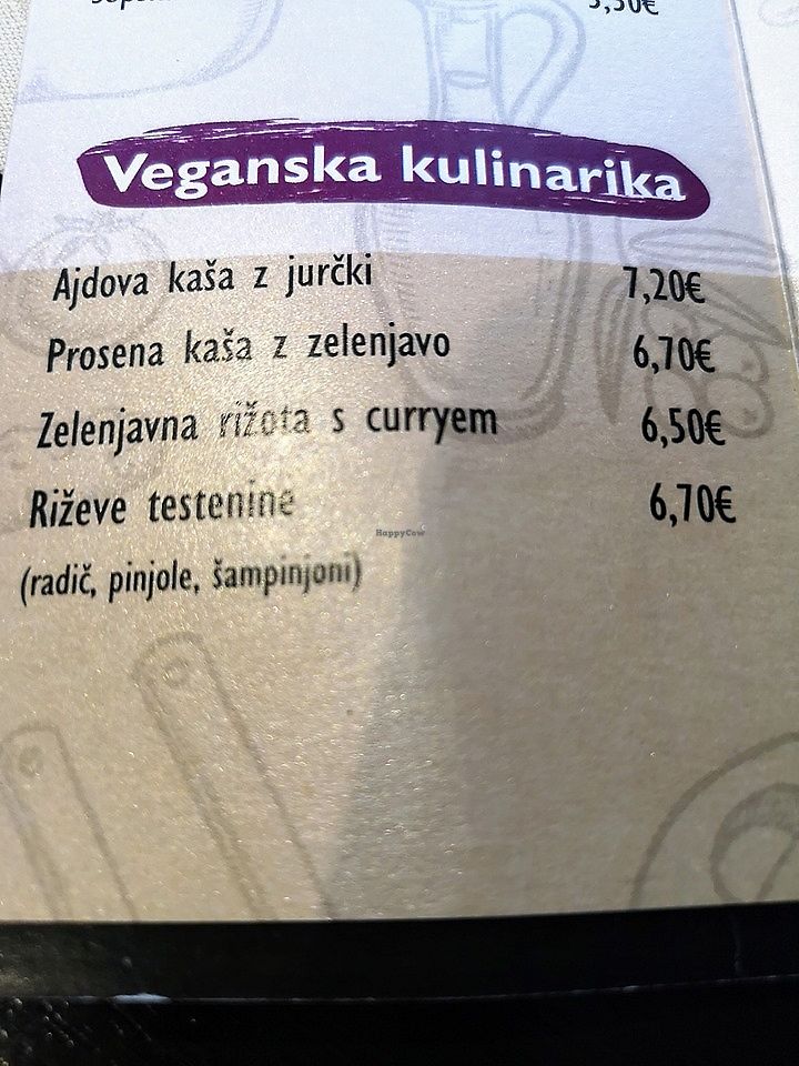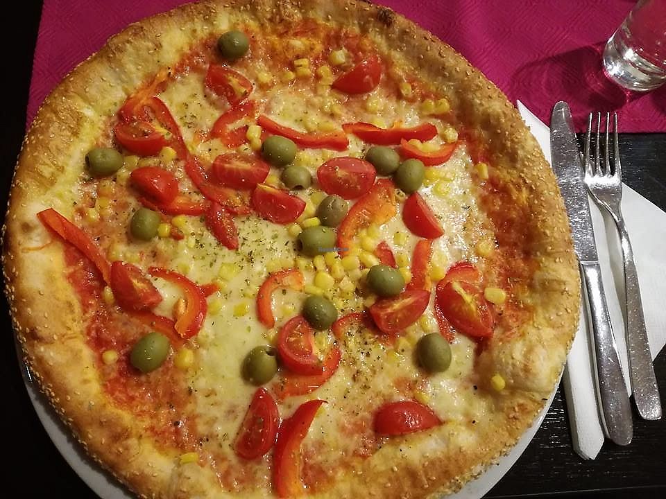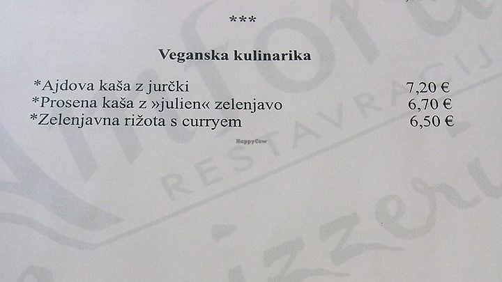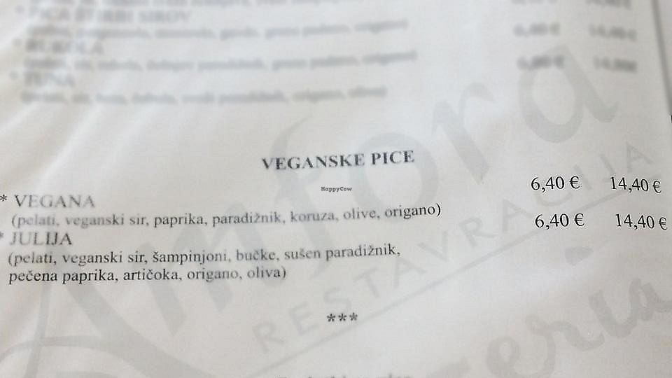 Amfora (which has some kind of tradition in Ptuj) introduced a small vegan menu in 2017. As of now (july of 2019) they offer vegan 6 vegan dishes. Two pizzas: pizza Vegana (pelati, vegan cheese, pepper, tomato, corn, olive, oregano), pizza Julija (pelati, vegan cheese, champignons, zucchini, dried tomatoes, pepper, artichoke, oregano, olive) - of course you can order some additions to both. You can also order buckwheat porridge with mushrooms, vegetable risotto with curry, millet porridge with julien vegetables and rice pasta with champignons, pine nuts and chicory. The kitchen is also willing to prepare one something that is not listed as a dish (but for example a combination of sidedishes). All vegan dishes of the menu cost from 6,5€ to 7,3€.
