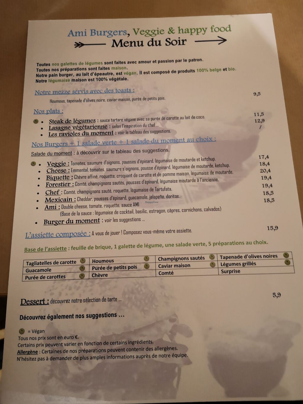 AMi as a straightforward menu: burgers (small and delicious, you need two for a meal),toasted sandwiches, salads, soups. It's uncomplicated but healthy, tasty and fresh. it's a good option for a cheap meal (10 to 12 euros + drinks)in the neighborhood.