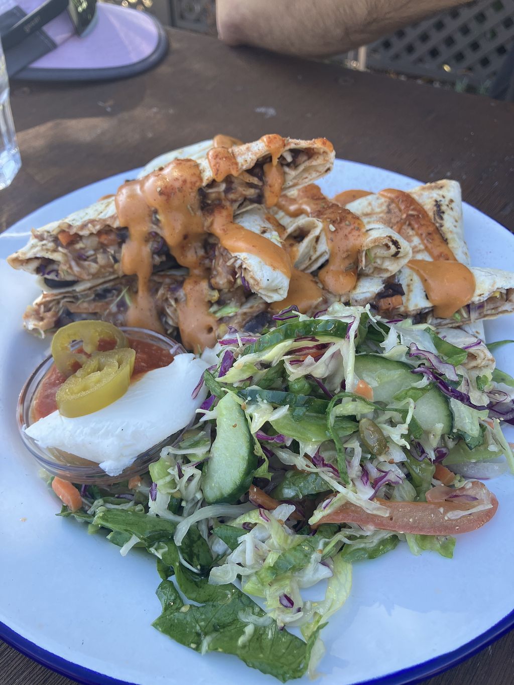 Vegan burrito, cauliflower taco, sweet potato taco, jackfruit taco.