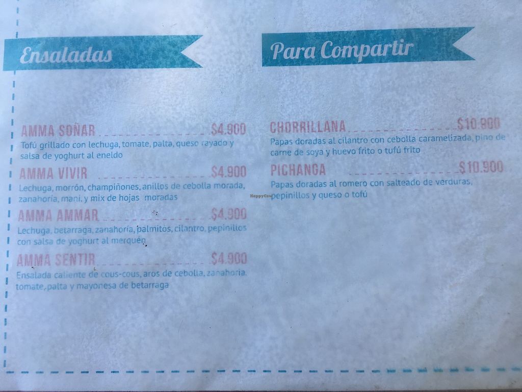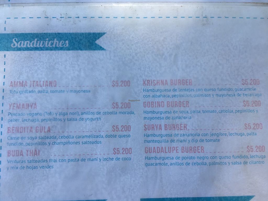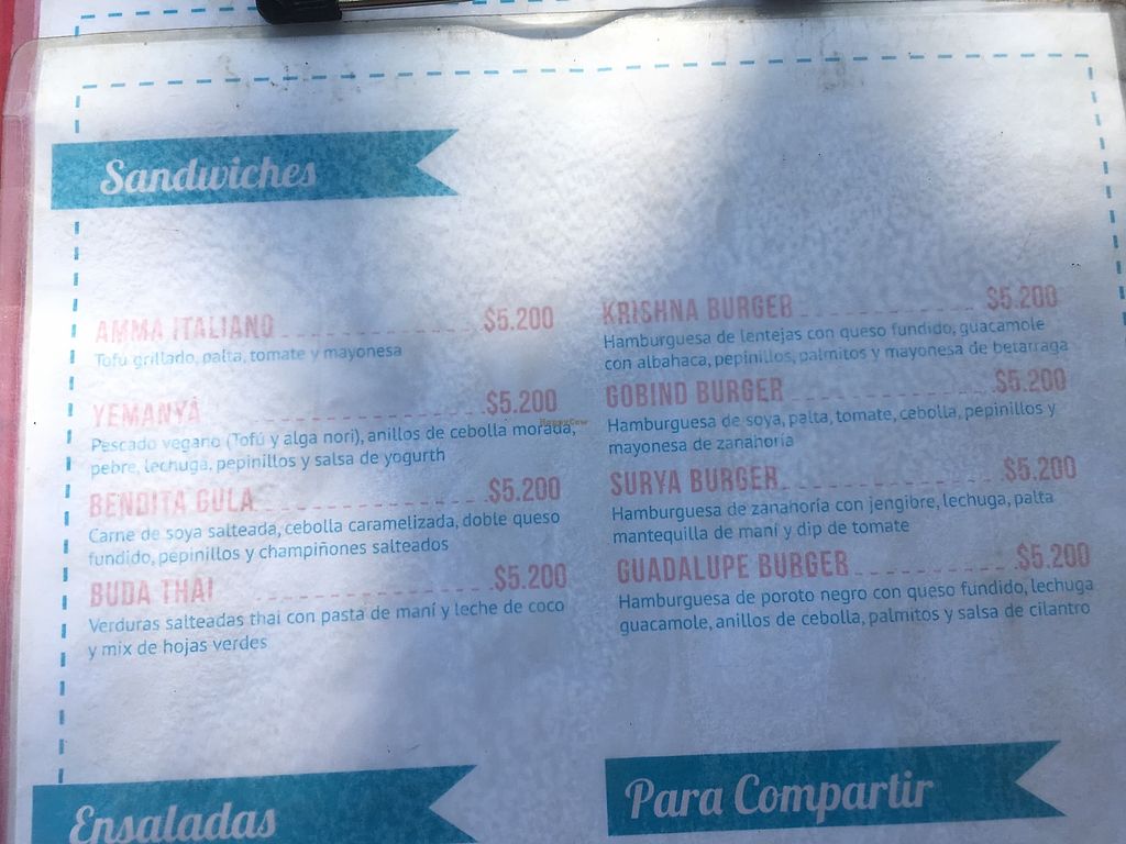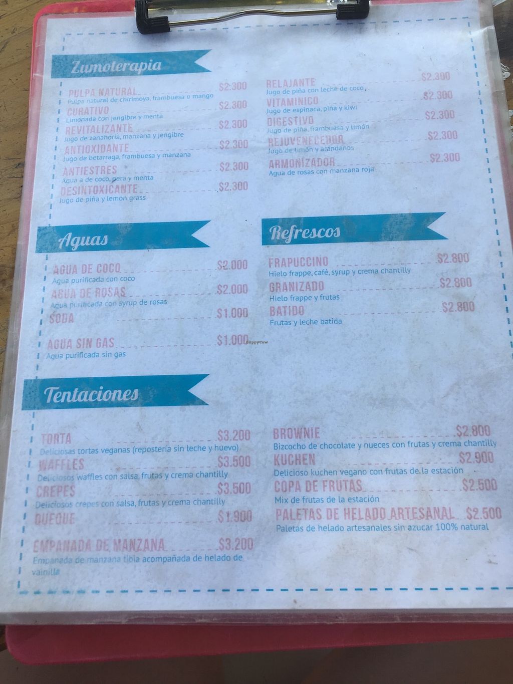We ordered the lunch menu for 5400 CLP today and we liked it. It contained of a big bottle of water, a small soup, a salad, rice and a stew of black beans and vegetables. As dessert they offer tea or coffee. Unfortunately they did not have any vegan dessert that day. It is a family restaurant and the service was very nice. Recommendable!