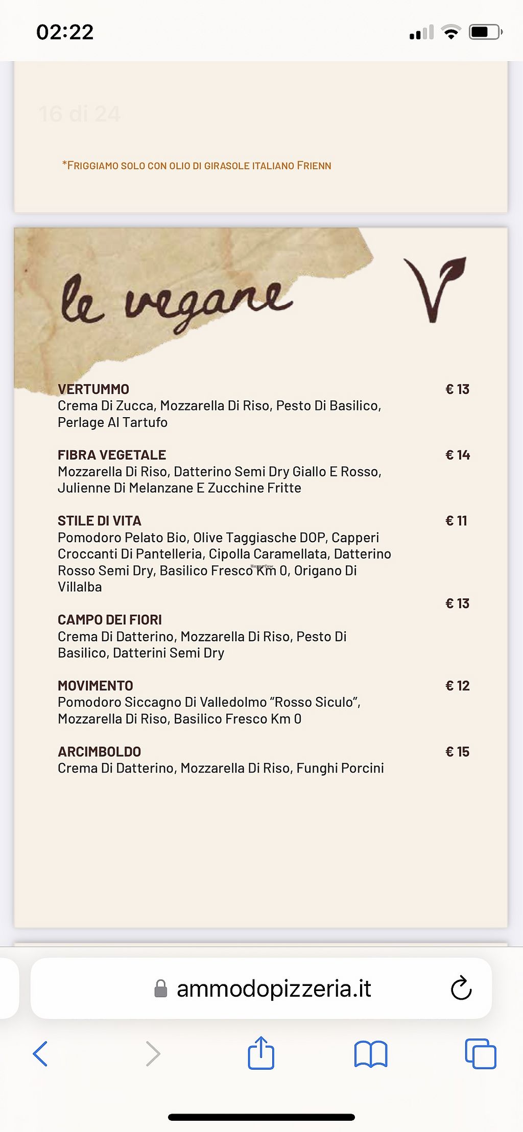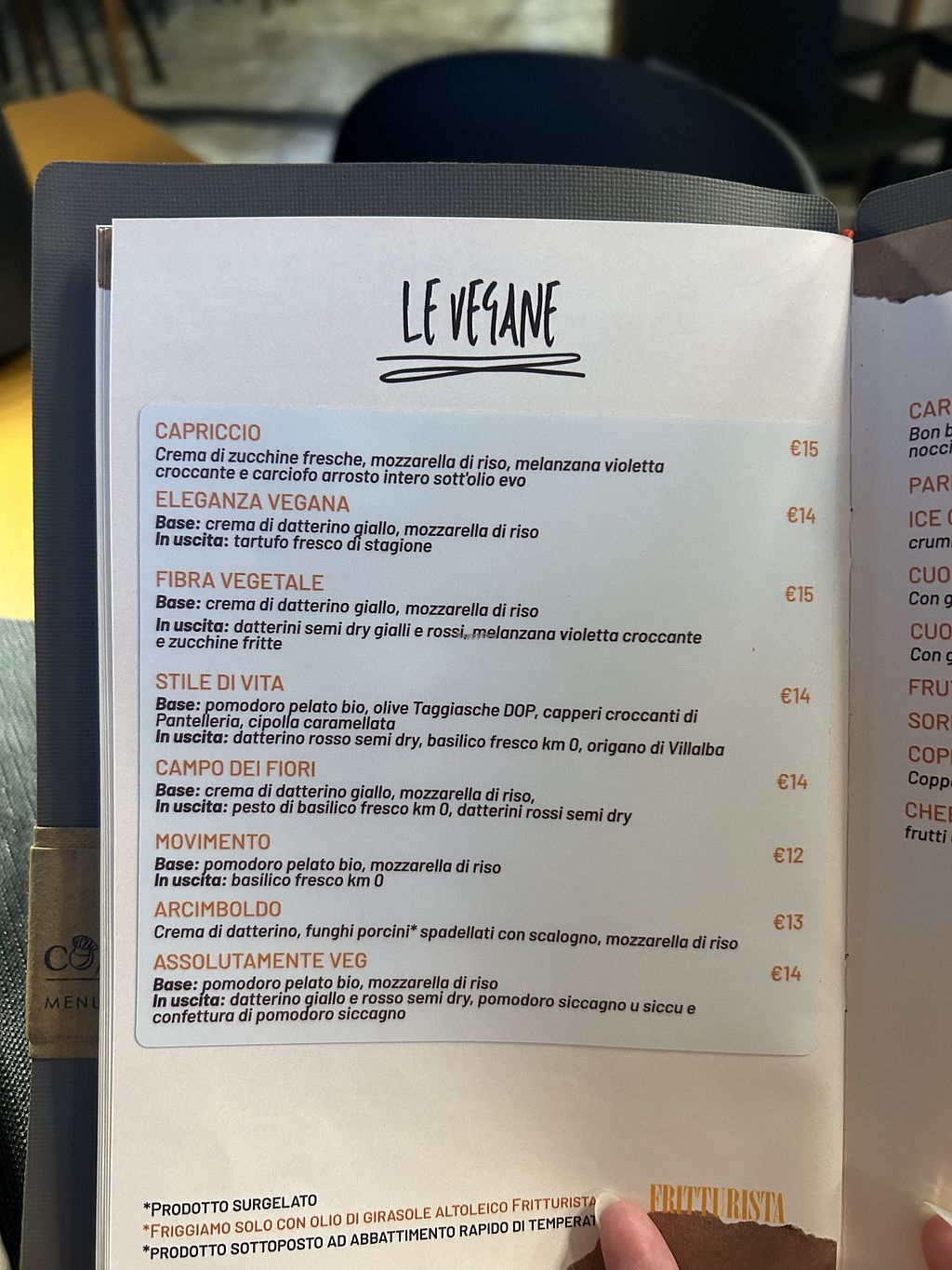 cute neighborhood spot (residential area/not very touristy and near several high rise apartment/condo buildings) that serves pizza for regular diet and vegan. they had a total of 8 vegan pizza options, some of which were similar to each other but nonetheless plenty of options. i tried two vegan pizzas - fibra vegetale and campo dei fiori. it appears they use rice based mozzarella which was tasty and very melty/cheesy. my omni husband enjoyed these vegan pizzas as well!