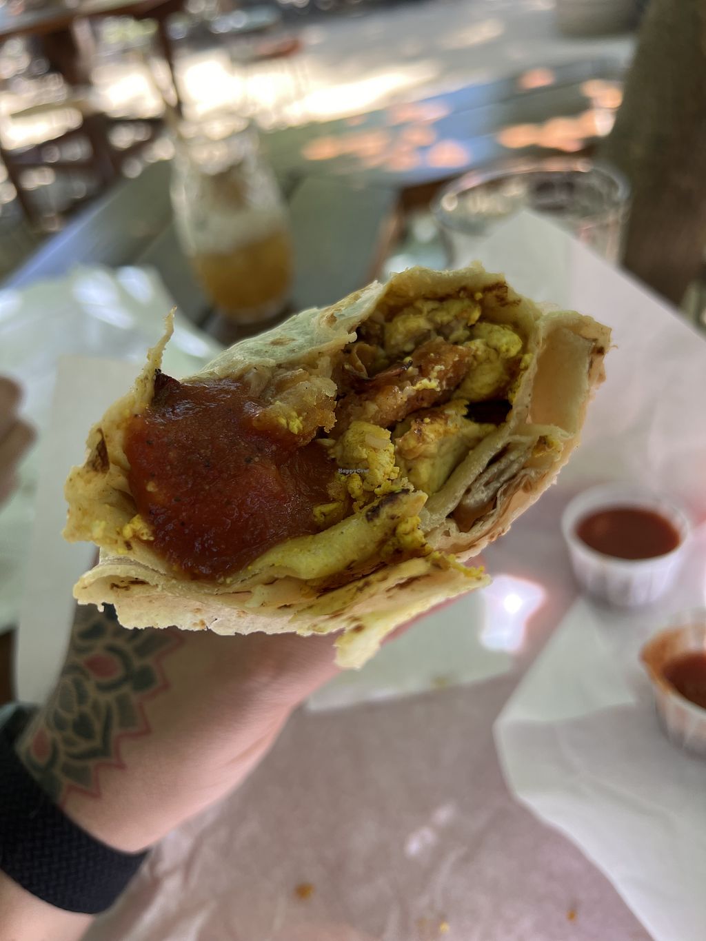 Bakon breakfast burrito with their red salsa