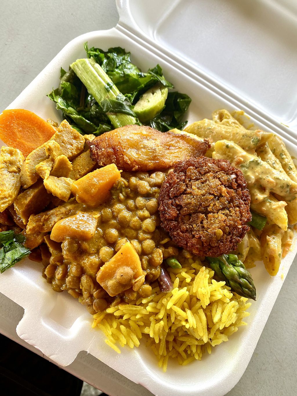 Real, Caribbean wholesome vegan food. Each day they prepare a "main" and several sides. Two of us ordered a "large" to share and it was the perfect amount of food for 2 people for lunch. On this day, it was a hefty portion of Caribbean-flavored tofu, surrounded by forbidden (black) rice, cooked cabbage/broccoli, lentil patties, fried plantains, and a rasta pasta. Appears to be frequented more by locals than tourists, not surprising being that it's off the beaten path, but SO worth going to! Don't be alarmed at the location, it's high on quality and culture, low on elegance. Would definitely go again!