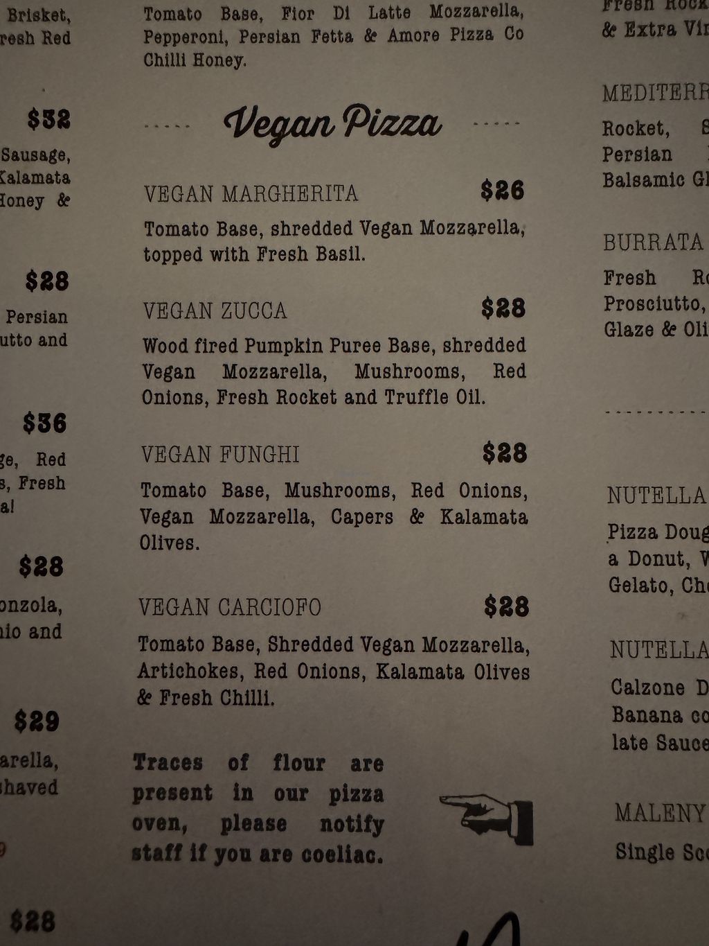 Delish options, 4 vegan pizzas on menu. Great setting, lovely staff and perfect vegan cheese.