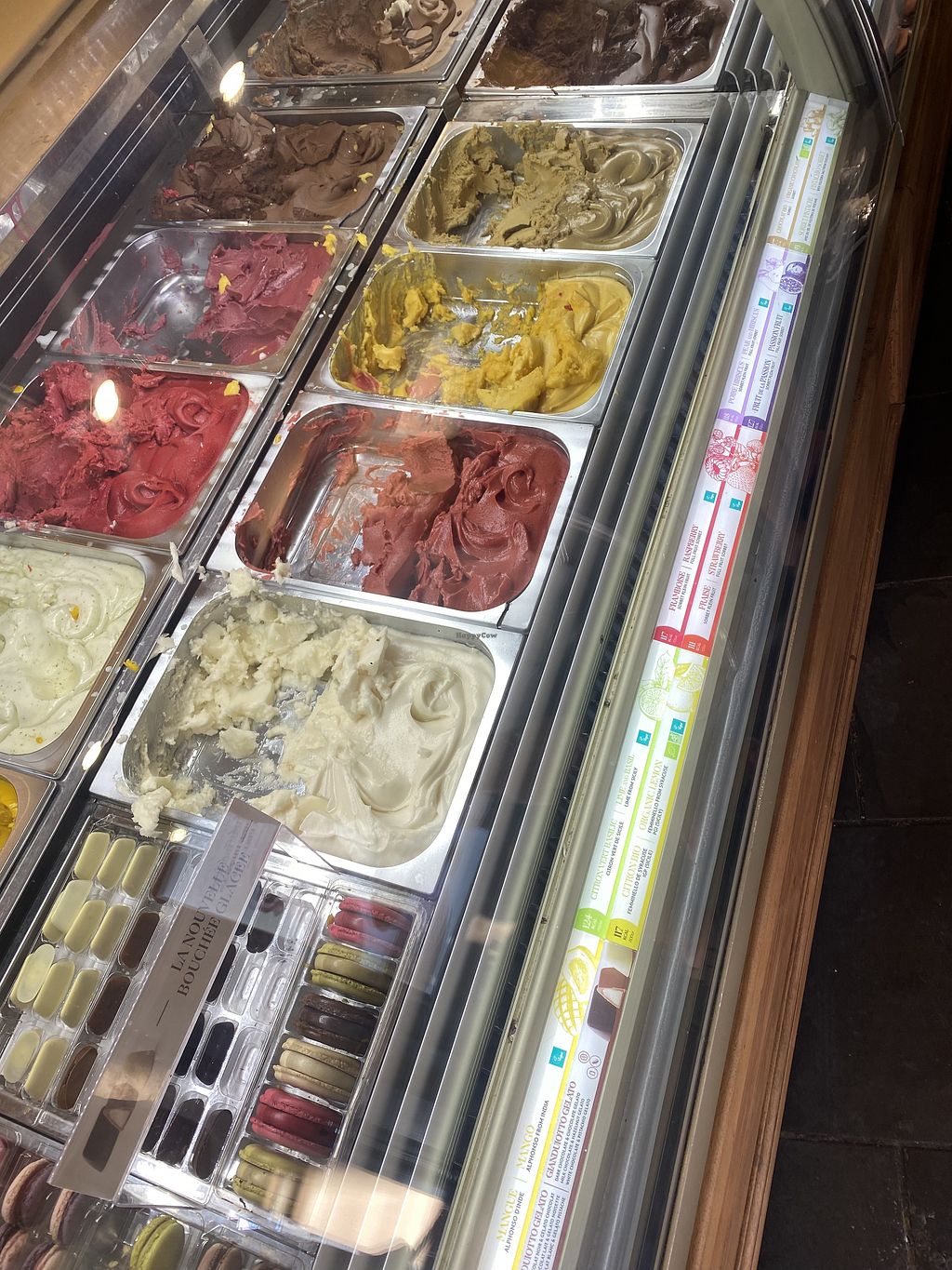 A great variety of sorbets with even very uncommon types as litchi. Not too sweet, not too fat. Simply aromatic.