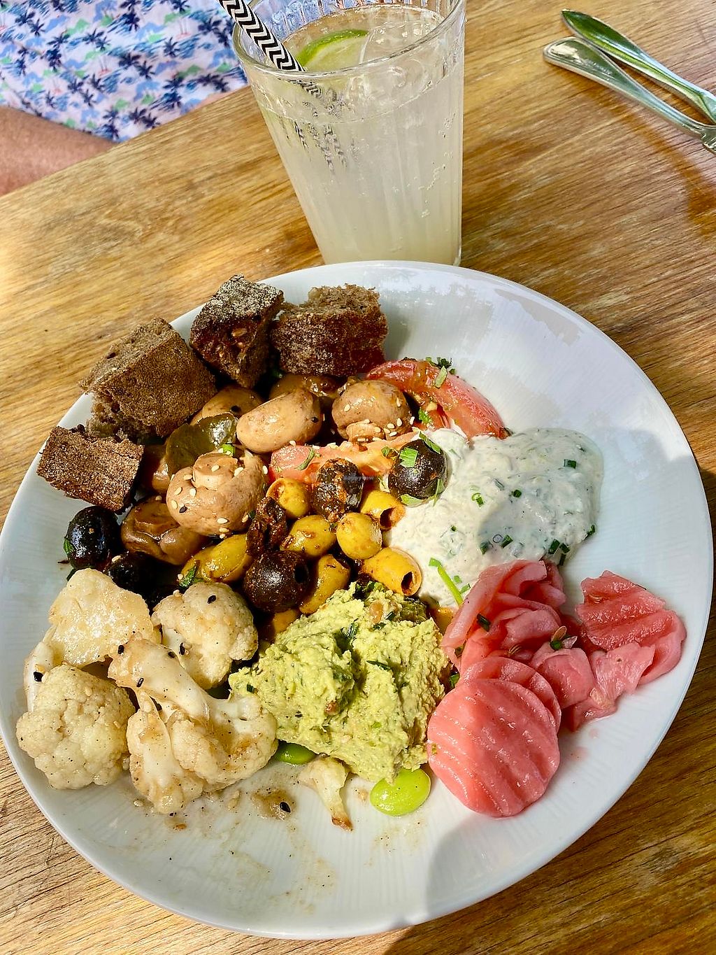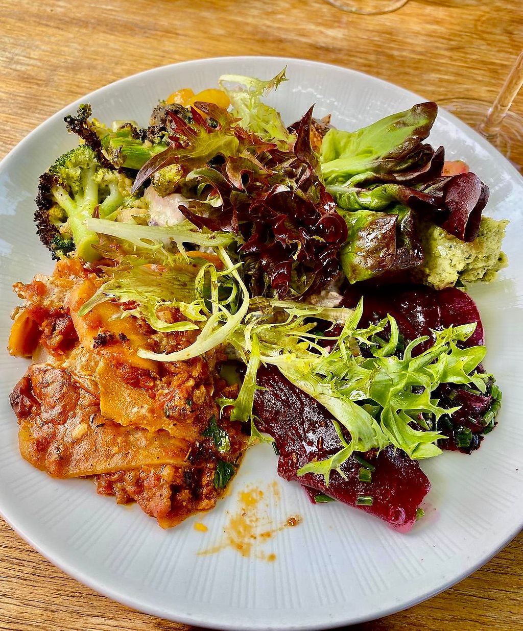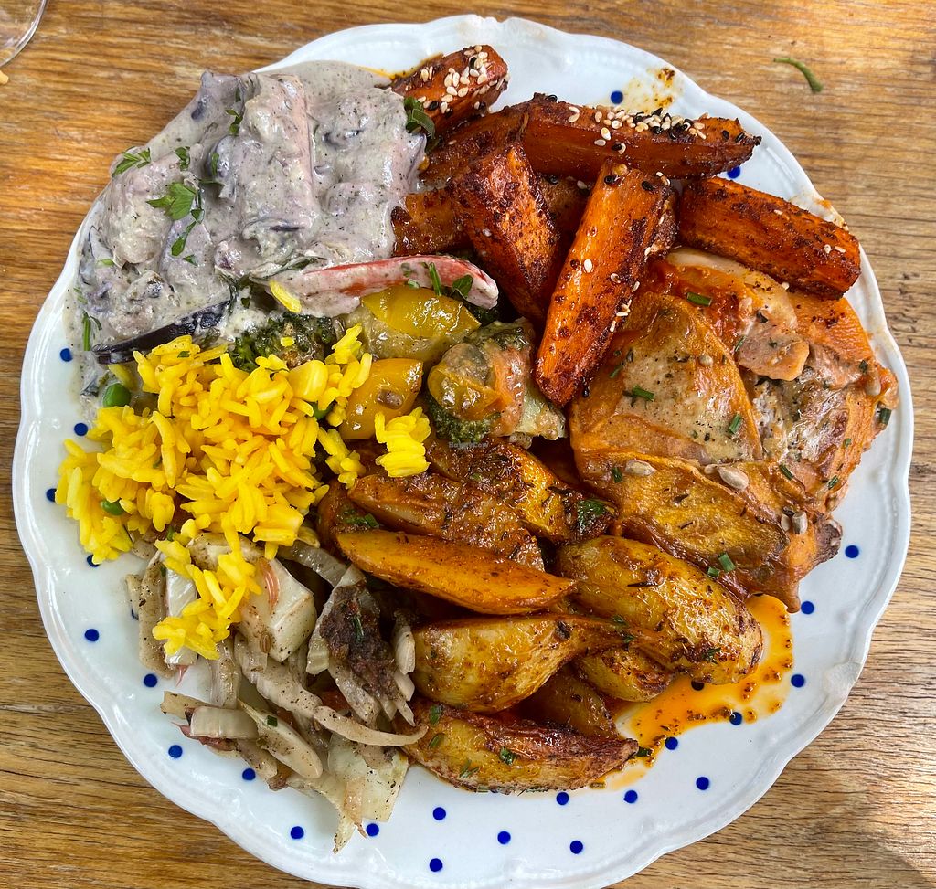 A lot of vegan options. From fermented greens and marinated mushrooms, over curries, pestos and dips to sometimes a vegan desert. A mixed plate for sure.