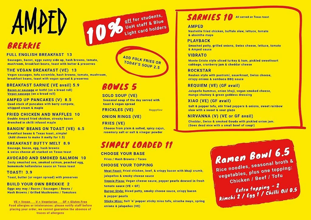 Serves meat, vegan options available. Café offering vegan breakfast plates, vegan sausage sandwiches, beans on toast, and porridge. Vegan sandwiches include tandoori falafel and salt & pepper tofu. Sides include sweet potato wedges, fries, and vegan loaded fries. Plant milk available for coffee and hot drinks. Open Mon-Sat 08:00-16:00. Closed Sun.