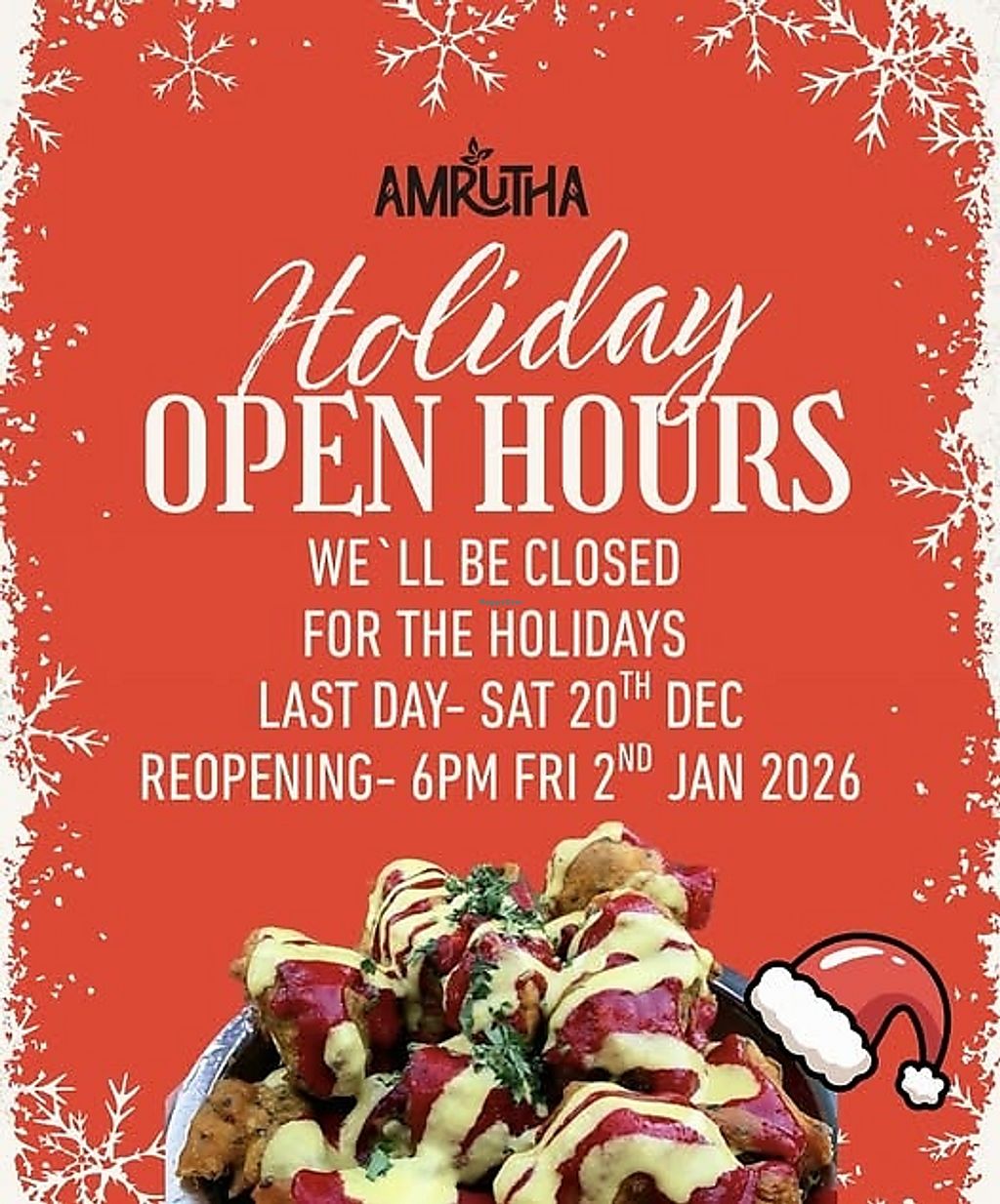 Est. May 2023. The food menu is very much the same as Amrutha Lounge. Serves vegan Indian & Asian fusion food. Some options may include crispy vegetable pakoras, falafel, dhal, Thai curry, rice, kale salad, gazpacho, mung beans and more. Open Wed-Fri 18:00-22:00, Sat 13:00-22:00, Sun 13:00-21:00. Closed Mon & Tue.