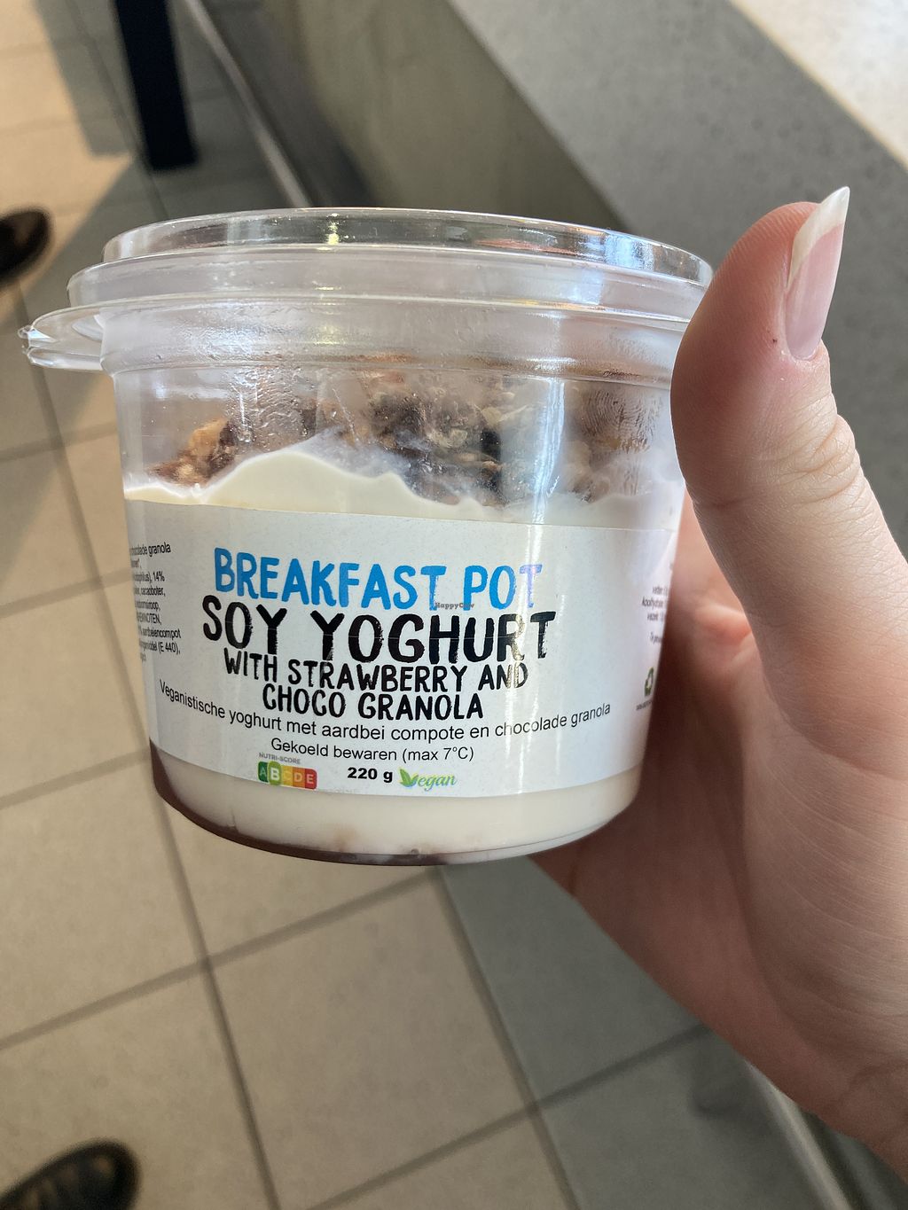 I found this to be the place with the most vegan options in Schiphol, and they are also clearly labeled. They have 3 vegan salads, a spicy falafel wrap and vegan yoghurt with granola. Me and my partner had the latter two which were very good. For airport prices it was quite cheap (6/7 euros per item). All coffees are offered with oat milk without extra charge.