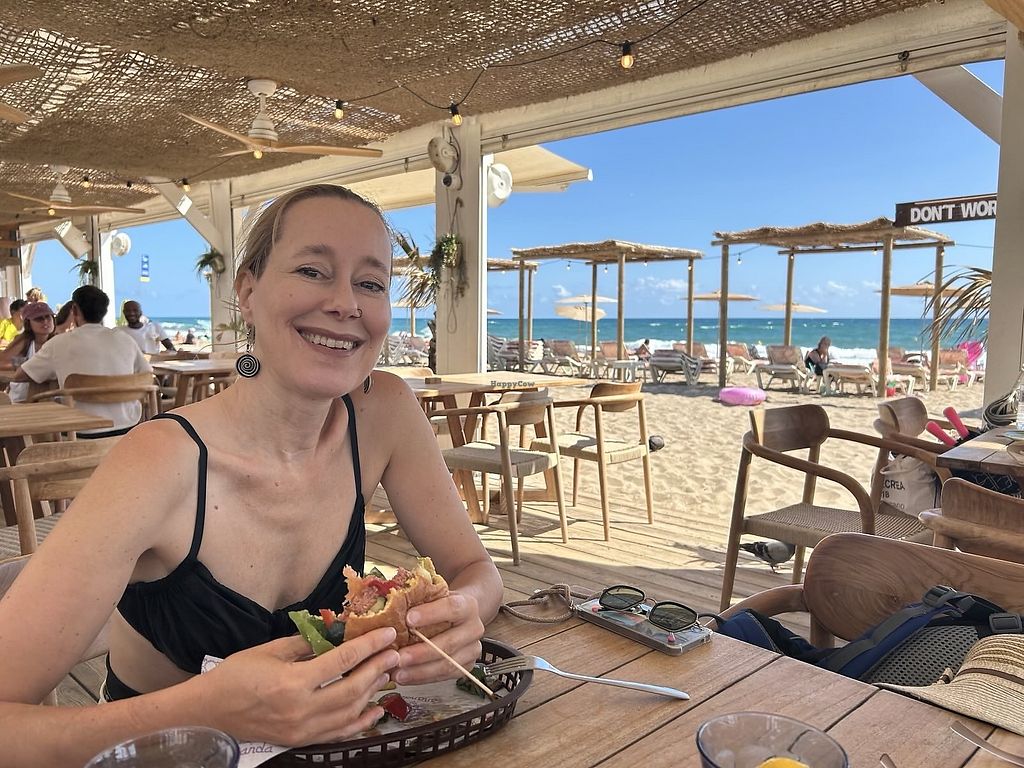 Shady seating, nice choice on the menu, clearly labeled, very friendly service. Plus they have oat and soy milk for the coffee. All you need for a perfect day on the beach.