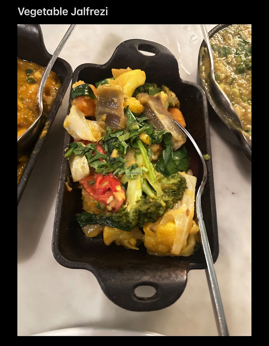 Serves meat, vegan options available. Upscale Indian restaurant with vegan choices. Menu includes chana (chickpea curry), bindhi piyaaz (okra), benghan bhartha (baby eggplant), and vegetable jalfrezi. Menu notes substitutions/modifications are kindly discouraged Open Tue-Thu 4:00pm-10:00pm, Fri-Sat 4:00pm-11:00pm, Sun 4:00pm-10:00pm. Closed Mon.