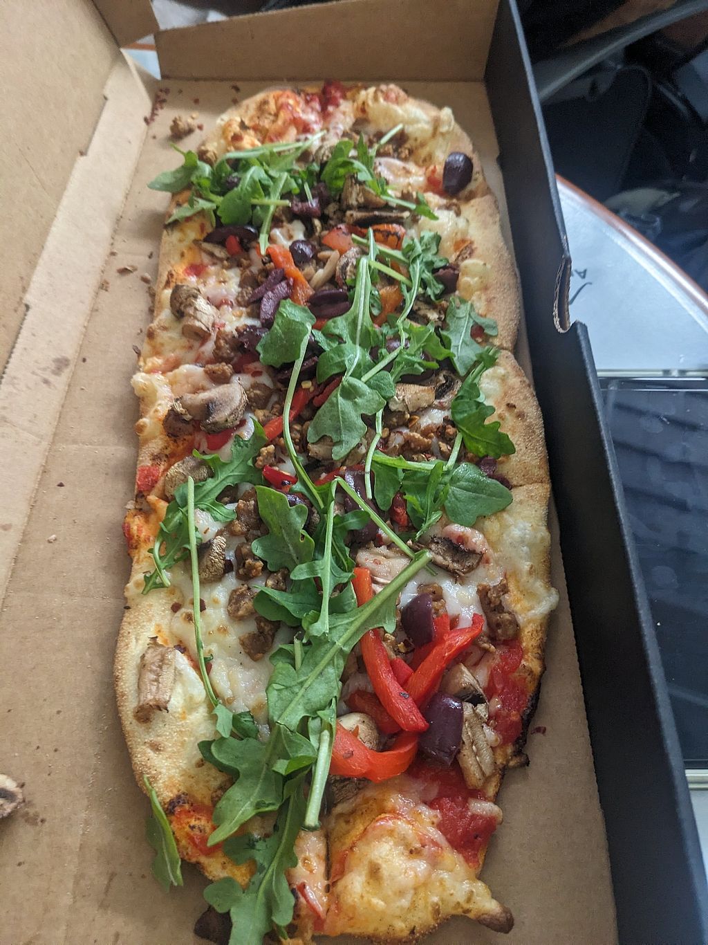 The pizzas are quite large, which is great when you have a long flight ahead of you. It's great to have some leftovers. I survived a 10 hour flight with no complimentary meal service thanks to &pizza. (OK, United, I guess DC to Honolulu is a domestic flight, but it still feels wrong to not serve food...) The box however is a pain, so I try to have a zip lock or something else to store it in so I can toss the box before my flight.