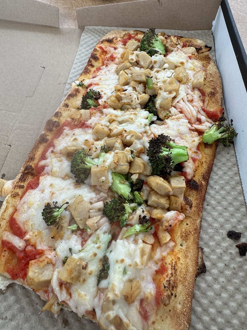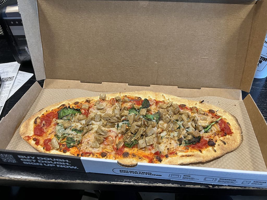 Lady at the counter was very clear with showing the (somewhat limited) vegan options, got red sauce, vegan cheese, spinach and vegan chicken and it's pretty good! with a drink came to $18 dollars which isn't bad for airport prices at all, especially considering the size