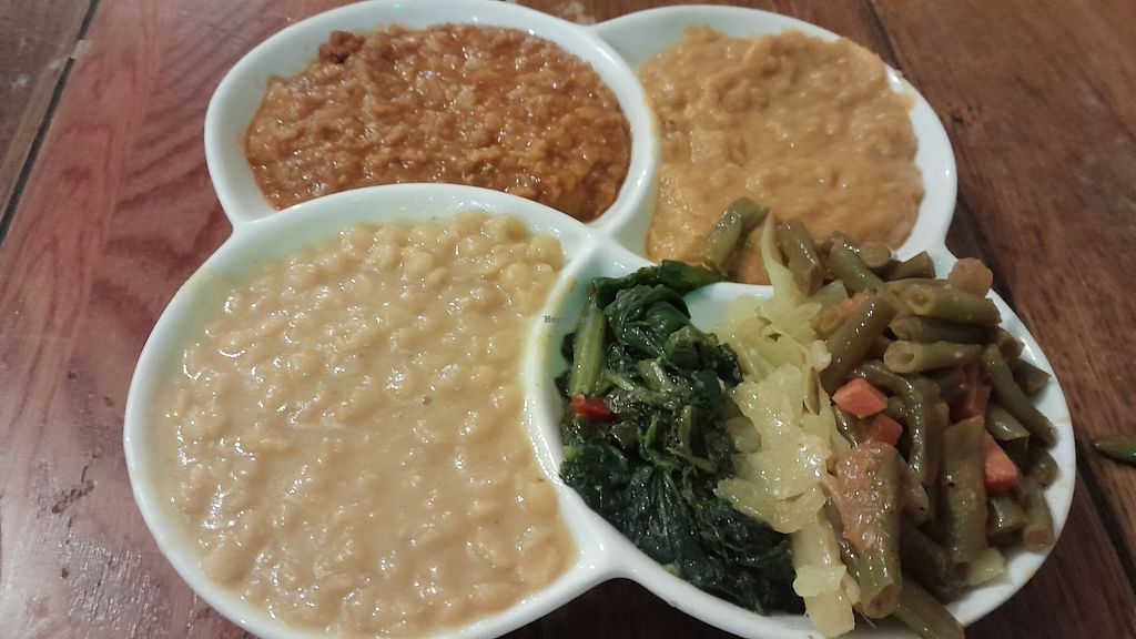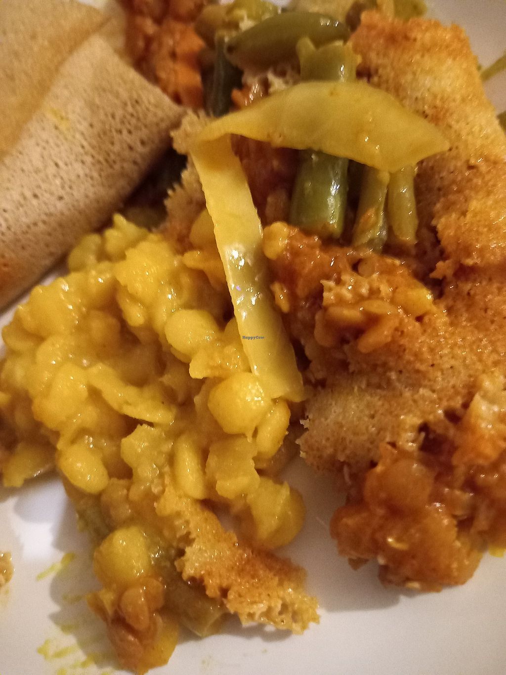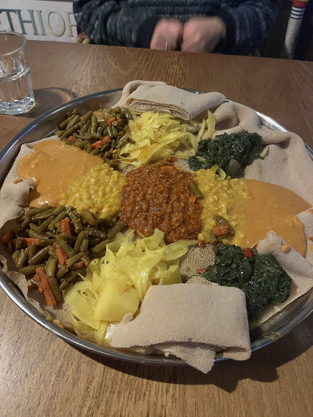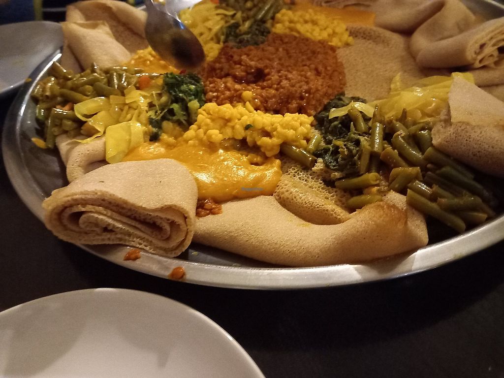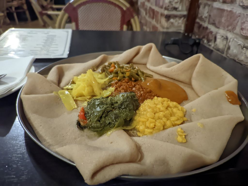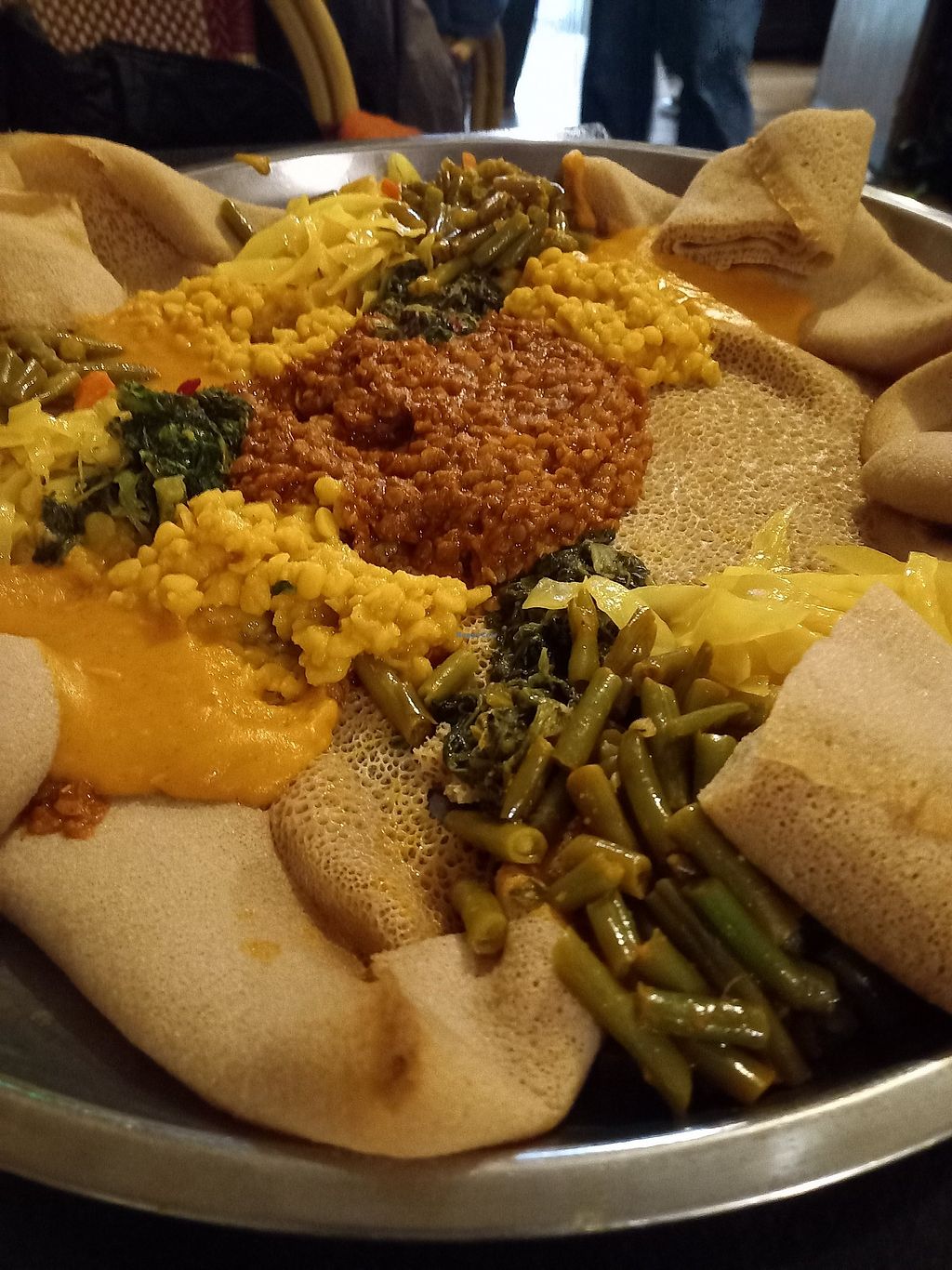 Injera and vegan dish with 5 different toppings.