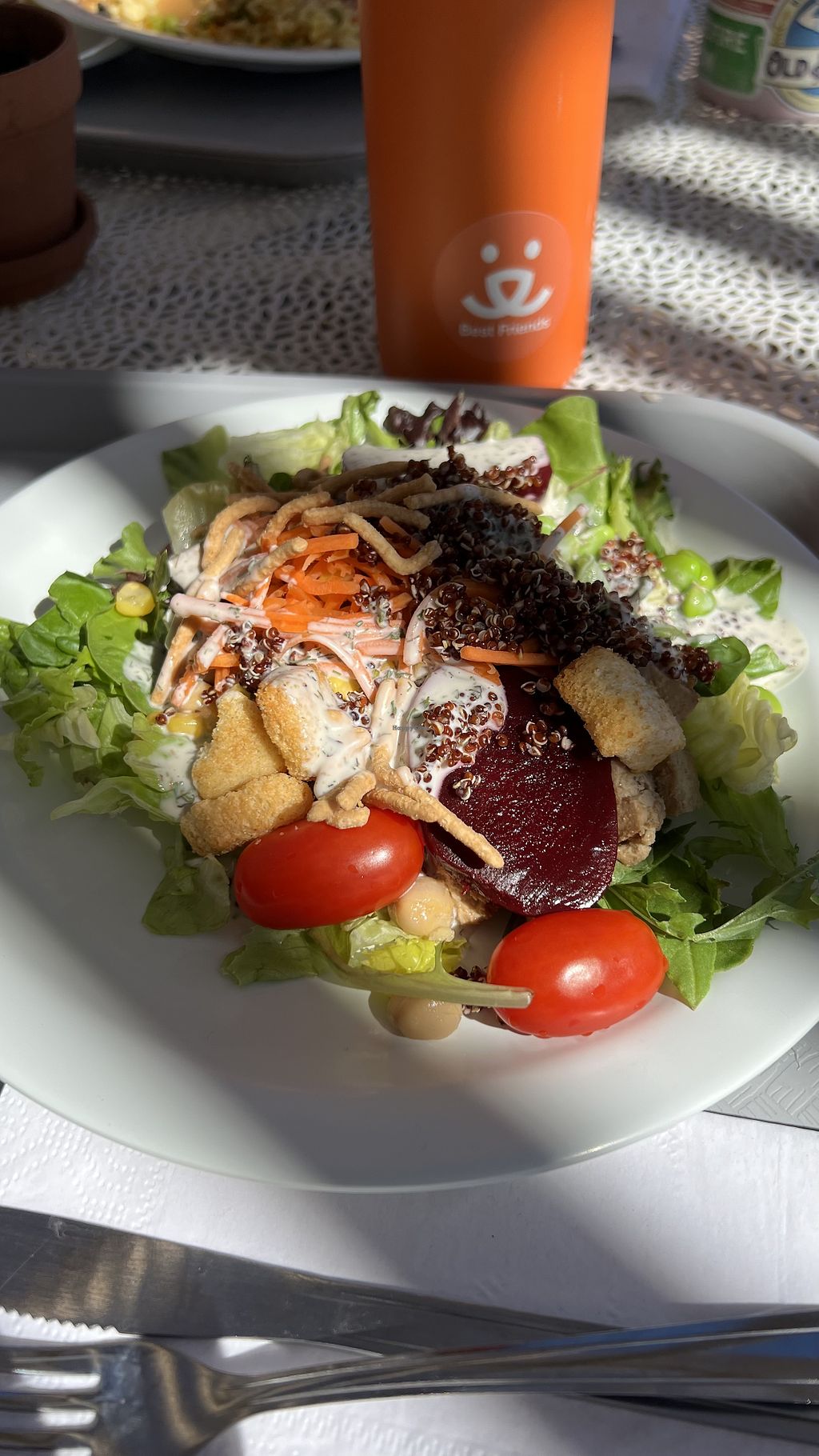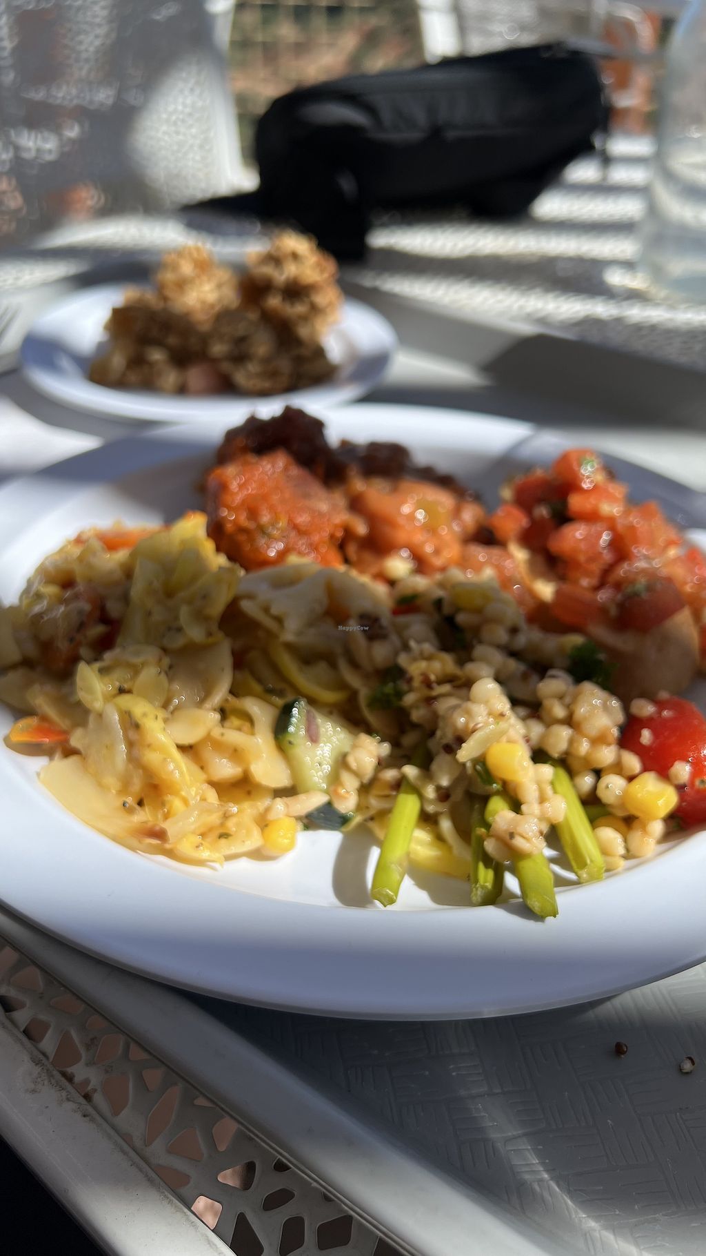 Pasta primavera with neatballs and asparagus, dessert was apple crumbl…