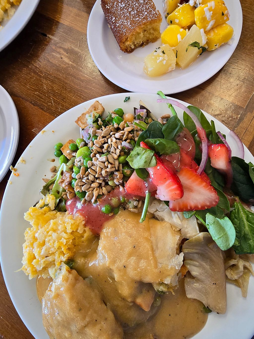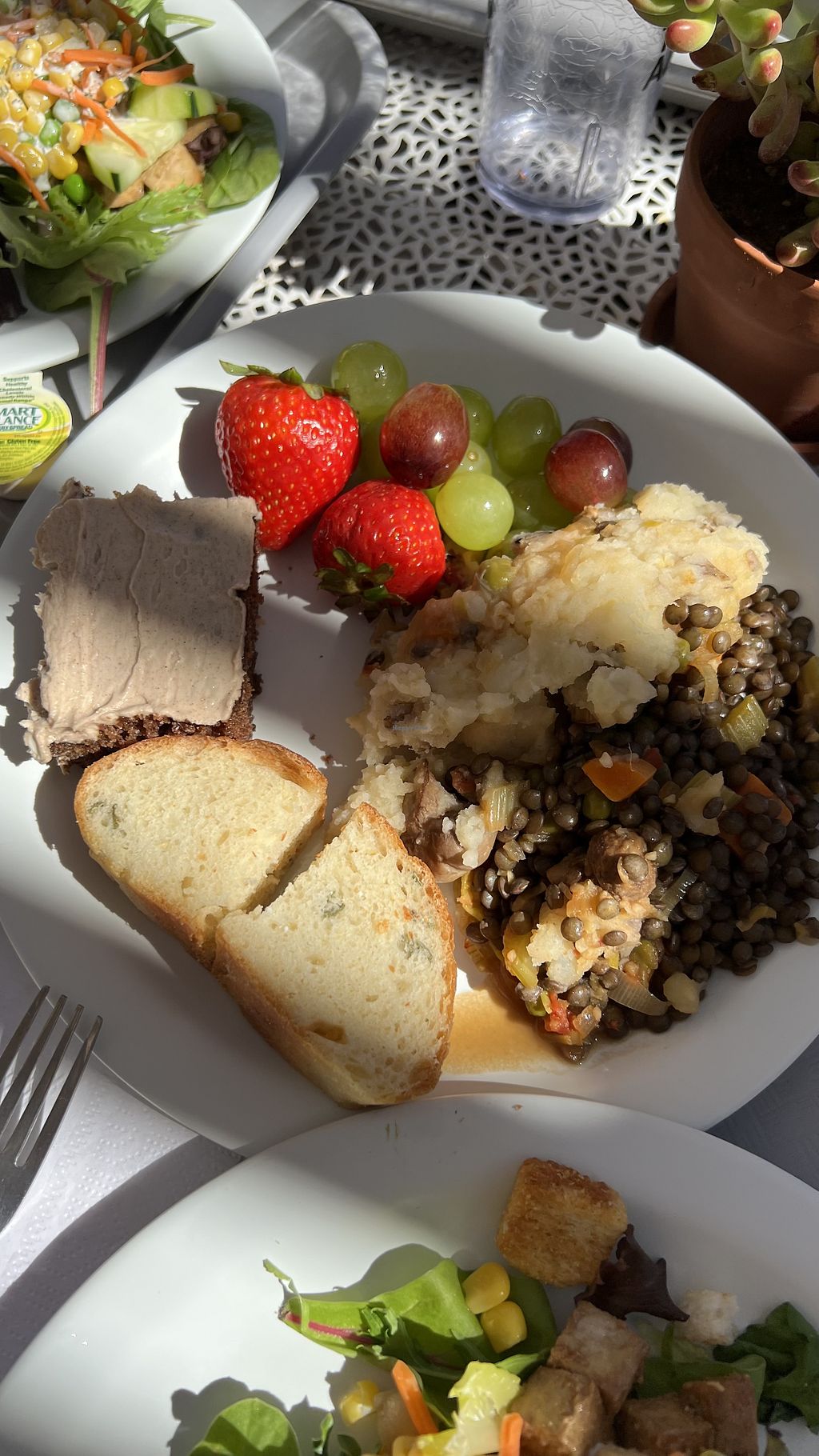 Gardener’s Pie, bread, fruit, and pumpkin-spiced cake