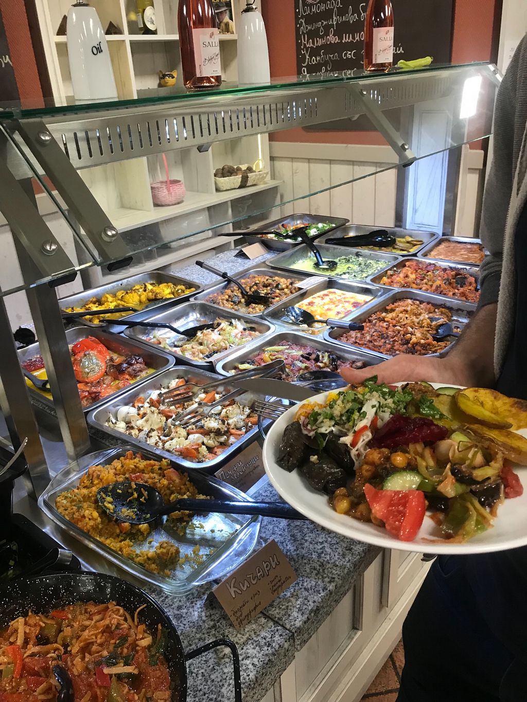 After traveling in Bulgaria for 10 days, this is my first time here have problem with choices, because that was too “many”options. I’m a vegetarian but I don’t like to eat only salad, they have many different dishes, you pay how much food you get, there are also vegan cakes. This is my favorite restaurant in Bulgaria so far, although the price for locals is expensive but it definitely worth it. BUT yesterday I went there is one dish with fish, the staff speaks some English, better ask before you get it, they are very helpful and friendly.