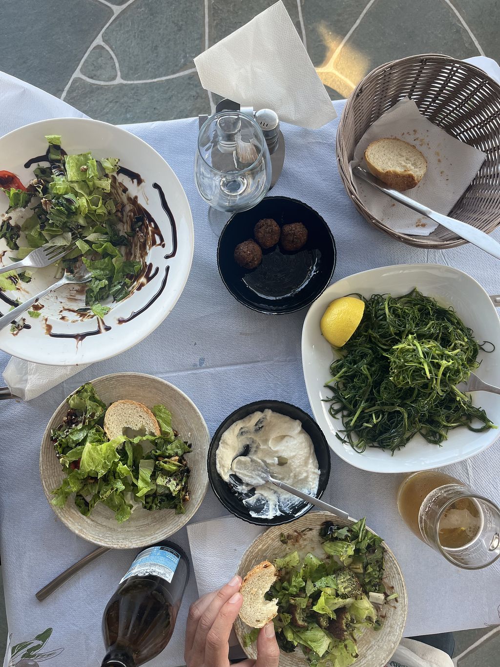 Cute small restaurant overlooking the Faros beach. Seems to be simpler and more traditional than the handful of others in the area. We had chickpea croquets (falafel?), a yum garlic dip, and a couple salads; one that was a local seasonal green that was like soft stringy seaweed (was yum). Server didn’t flinch when we asked what was vegan, pointed out more options than we ordered. It’s mostly a seafood menu but quite a few veg appetisers and salads that is enough to fill the table while you enjoy the view