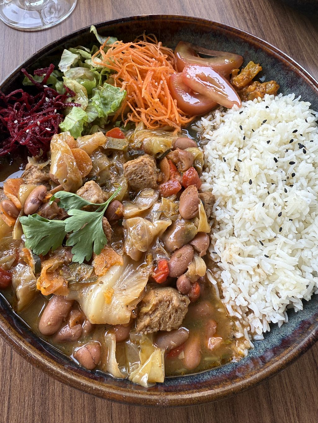 Big plates and tasty food. I had the stroganoff. I did not order dessert because of the language barrier. Not sure whether they had any vegan desserts.