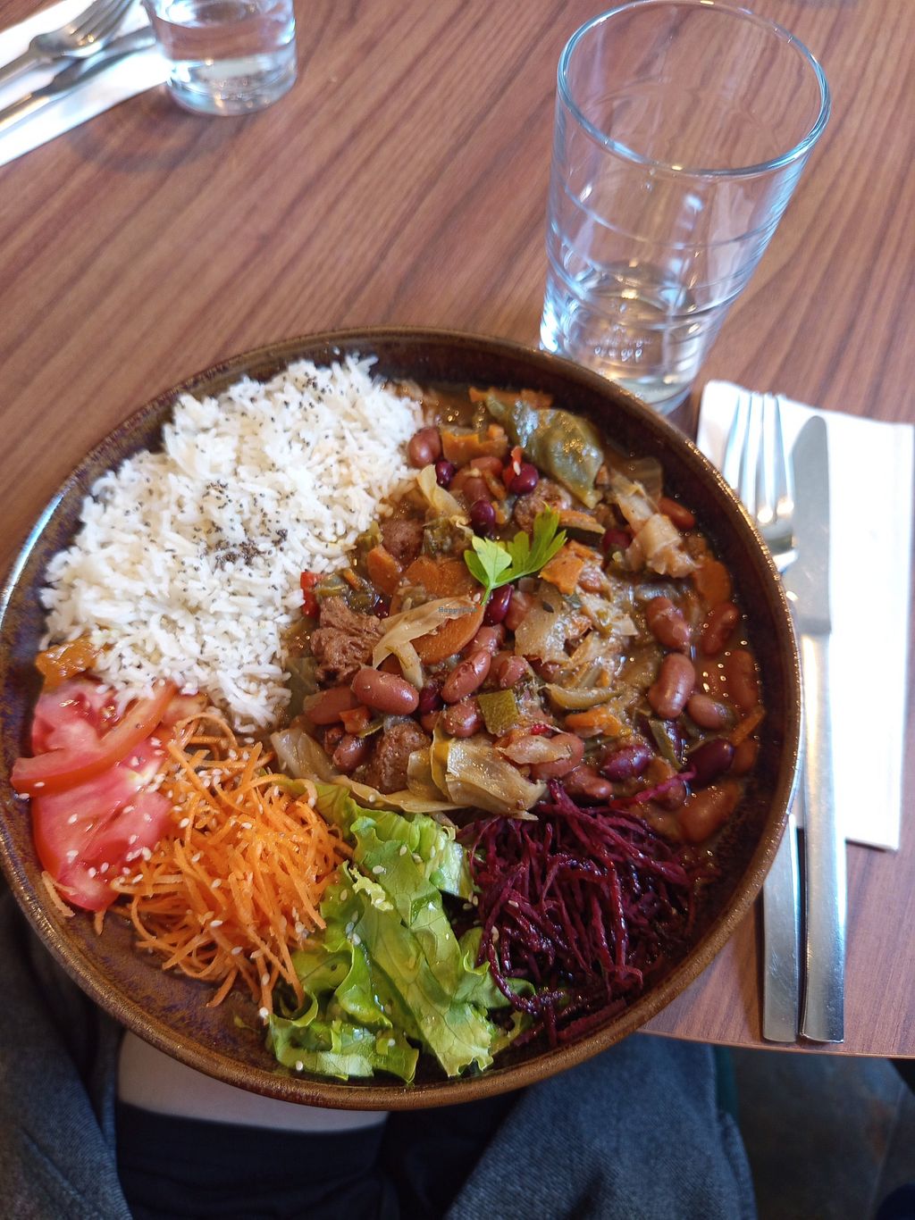 We were happy to find vegan dishes in this restaurant at the entry of the old city. We ate a vegetarian lasagna and beans/tofu, a tiramisu, and a so-called crumble. It was too expensive for the quality of the cuisine.