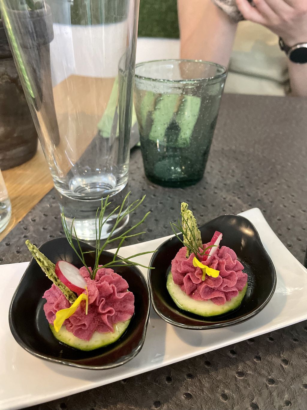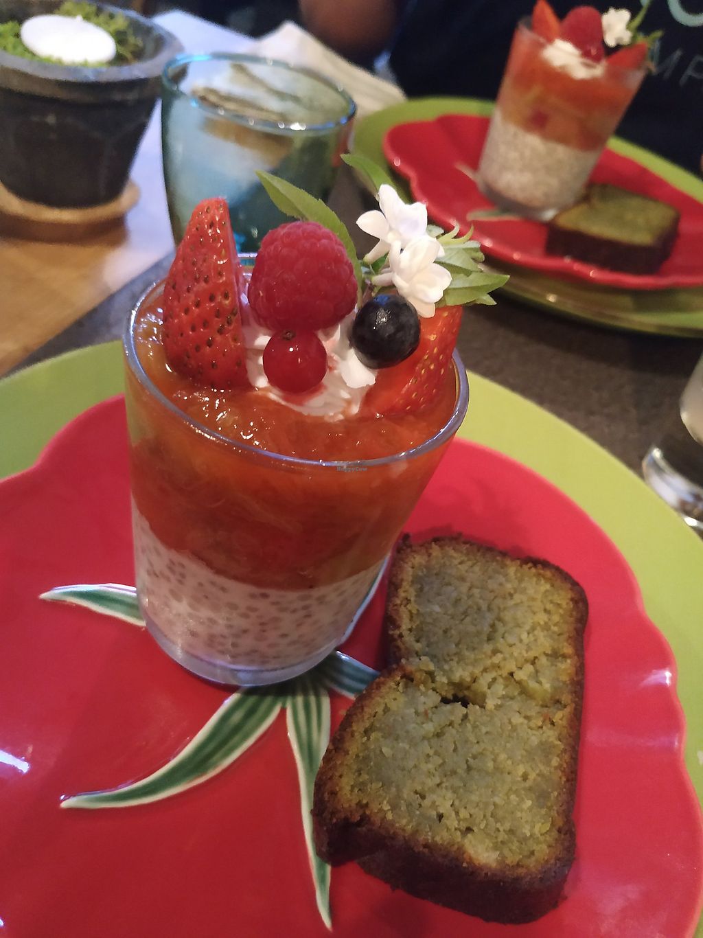 Verrine graines de chia avec compote rhubarbe-fraises + cake vert