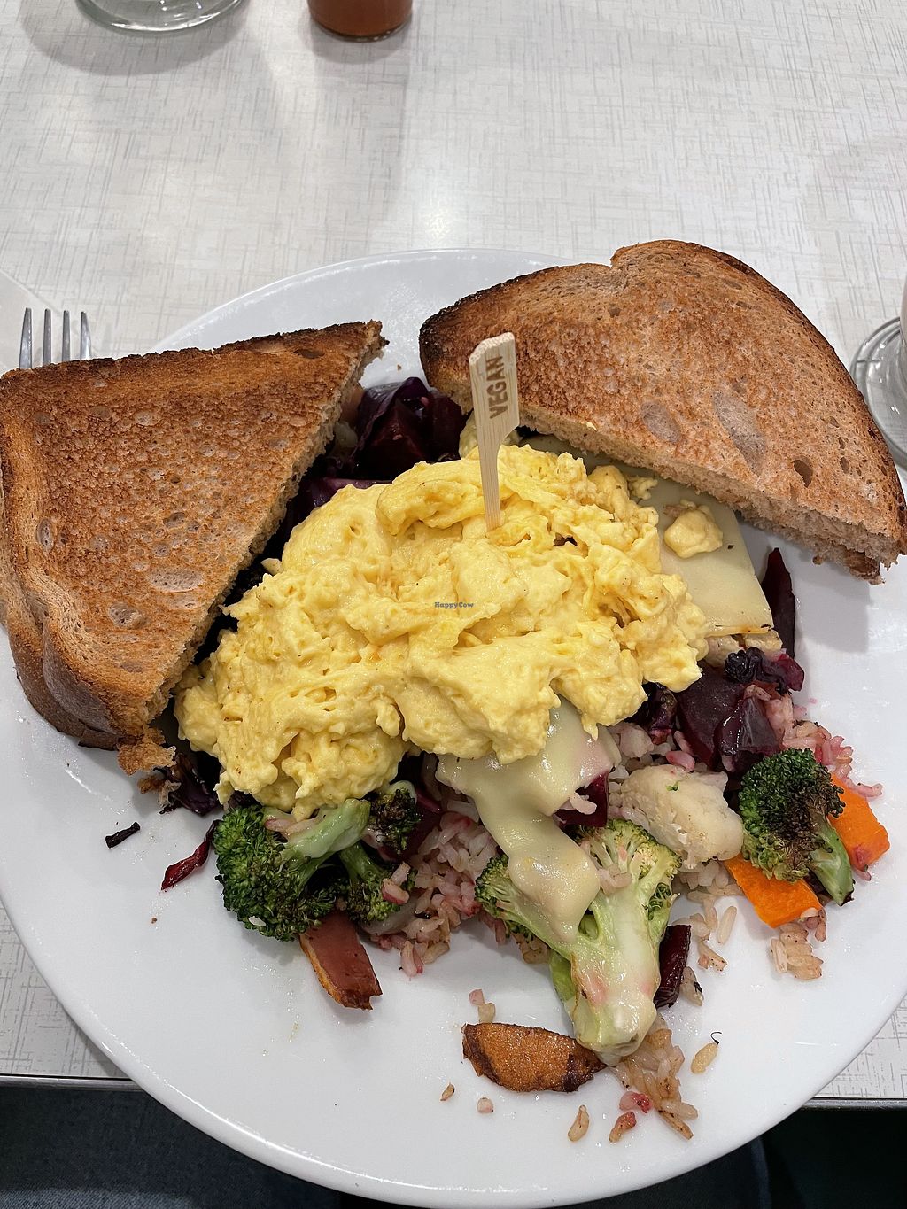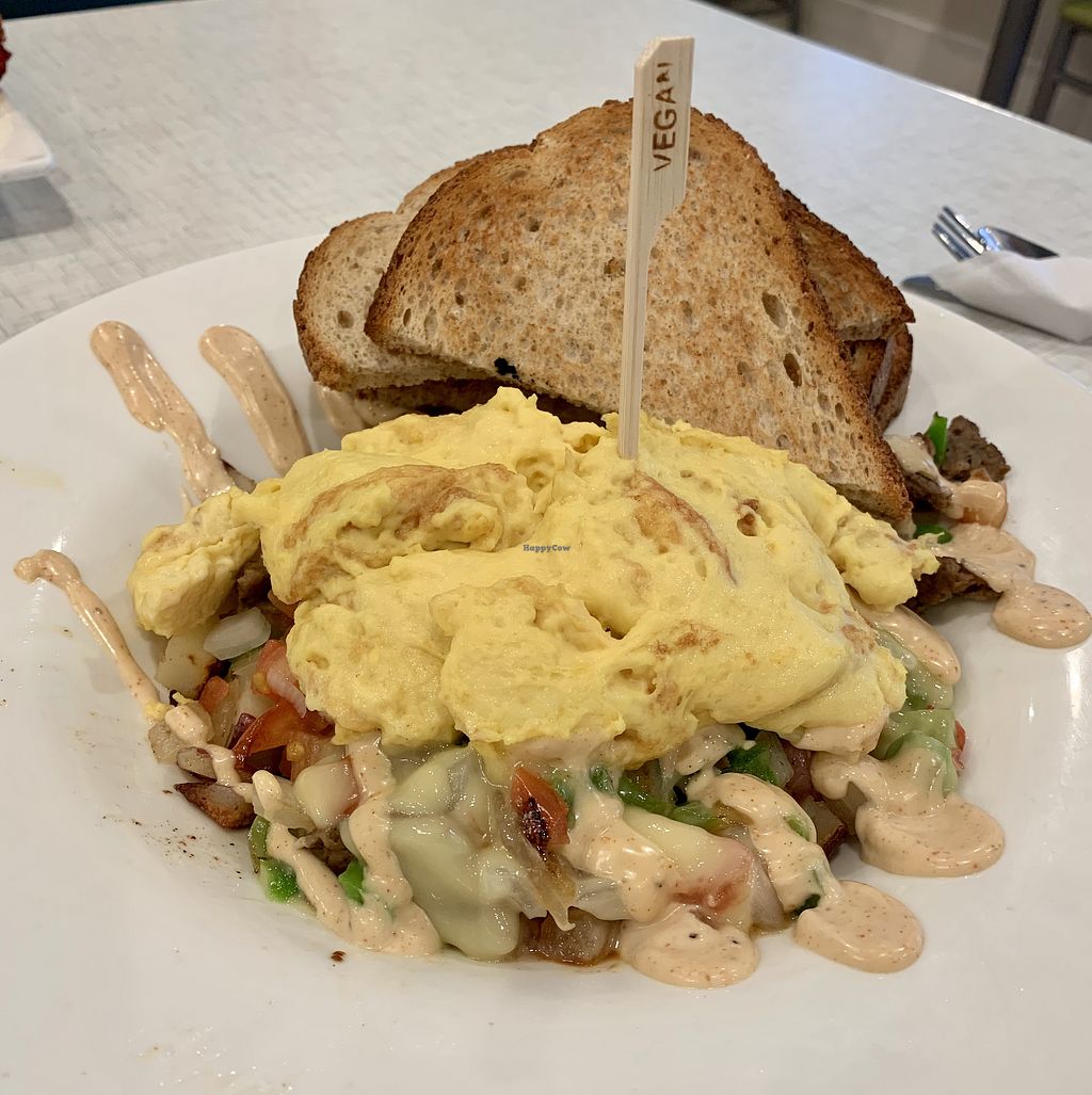 Vegan Scramble: Vegan Eggs, Vegan Sausage, Vegan Cheeze, Tomatoes, Gre…