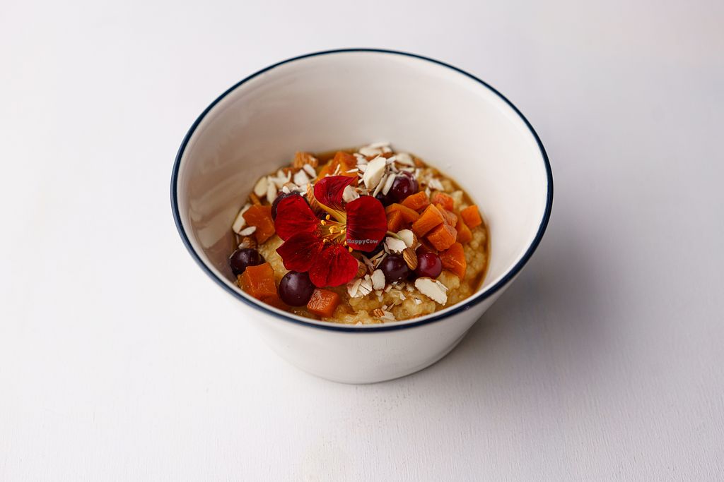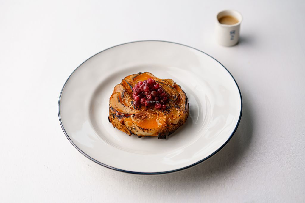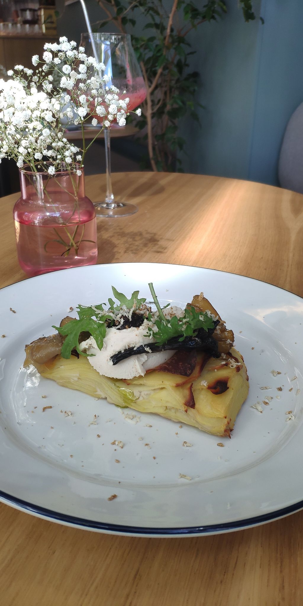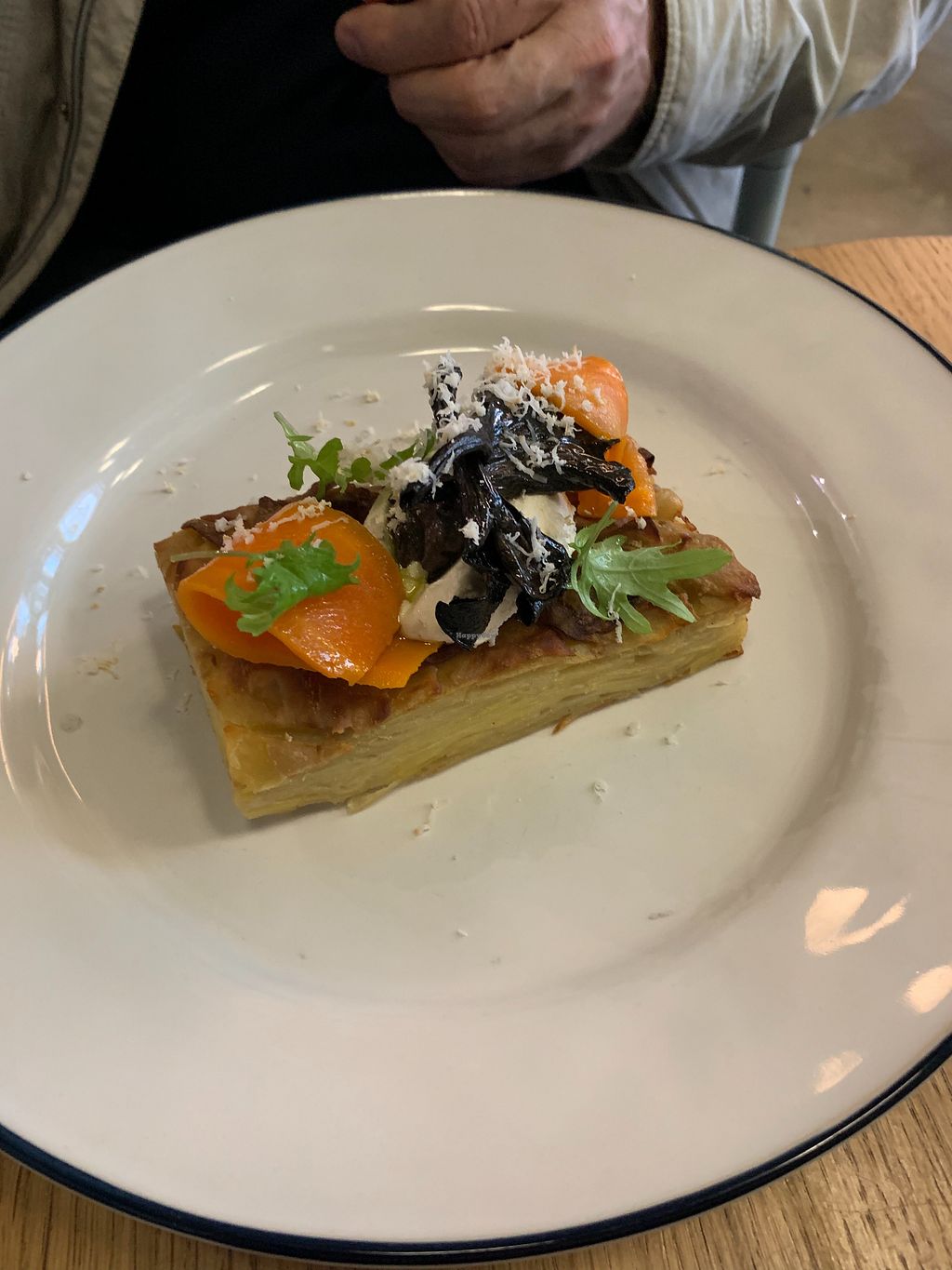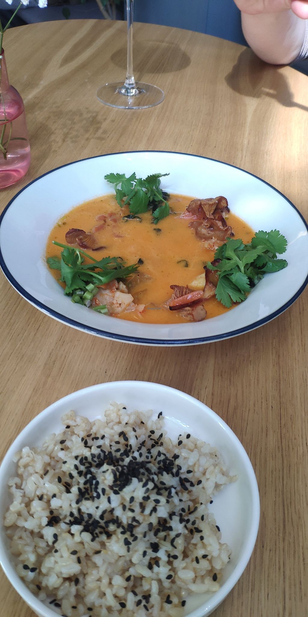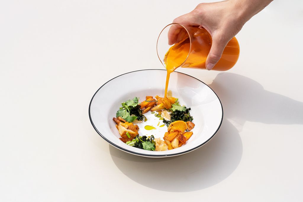 Kimchi soup with chanterelles, confit carrots and wakame seaweed