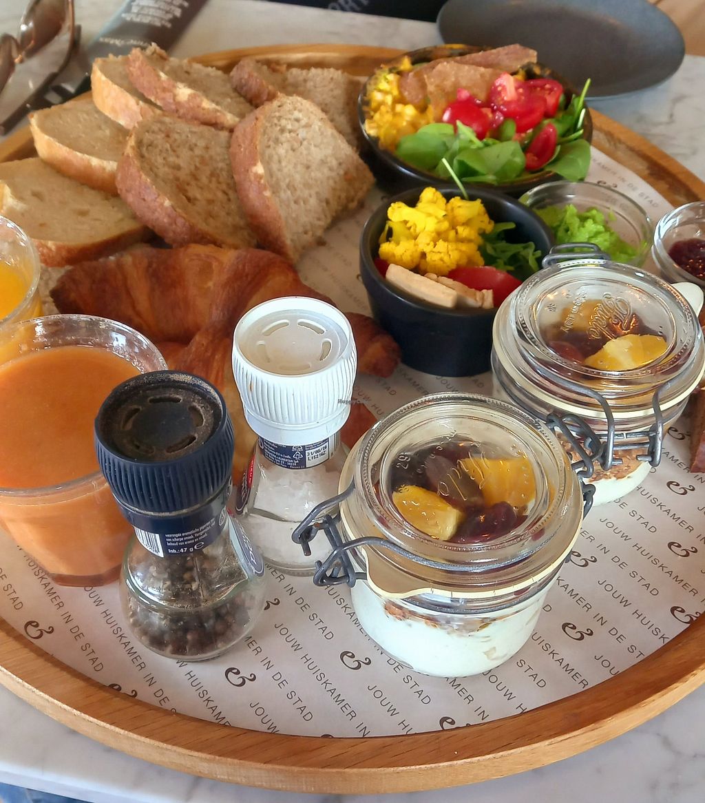 Read moreit took some time since the food arrived because there was only one cook, but it was LARGE. (we ordered one vegan and one for the omnis and the table was full!) the breakfast included (everything 2×) -several types and slices of bread -croissants -fruit juices -spreads (1× strawberry jam, 1× avocado spread) -scrambled tofu with salad and bacon -soy yoghurt with granola and fruits -banana bread slices.