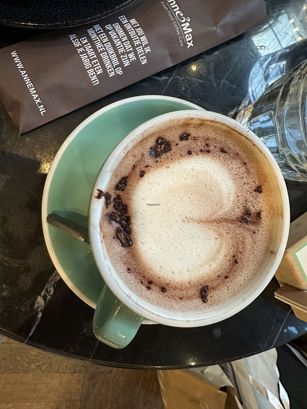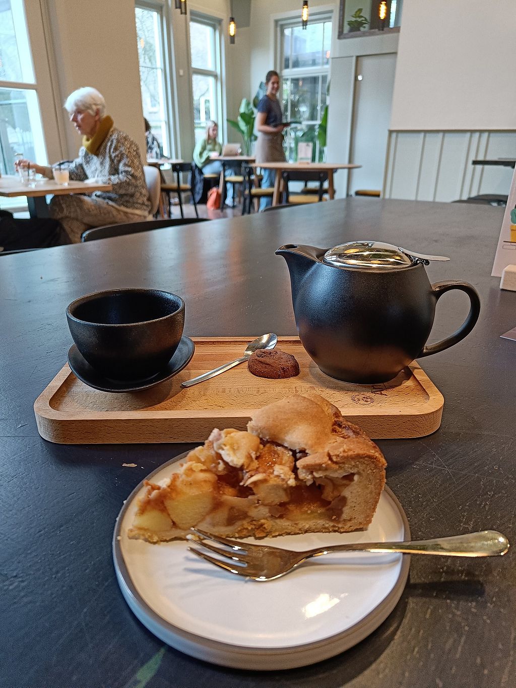 Vegan chai latte, flat white, chocolate cake and apple pie .