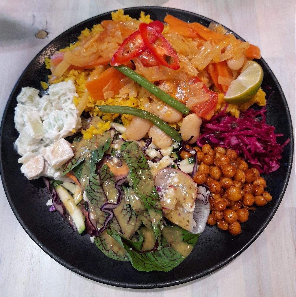 Today's meal consisted of red curry and three different cold salads. Was tasty and staff friendly.