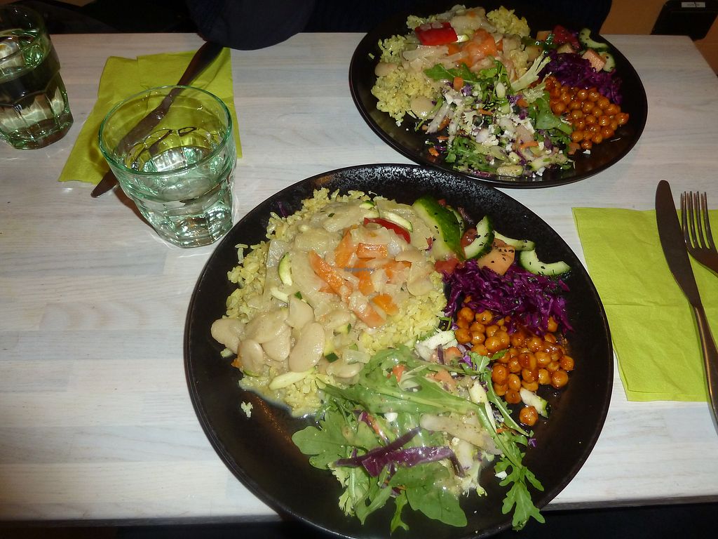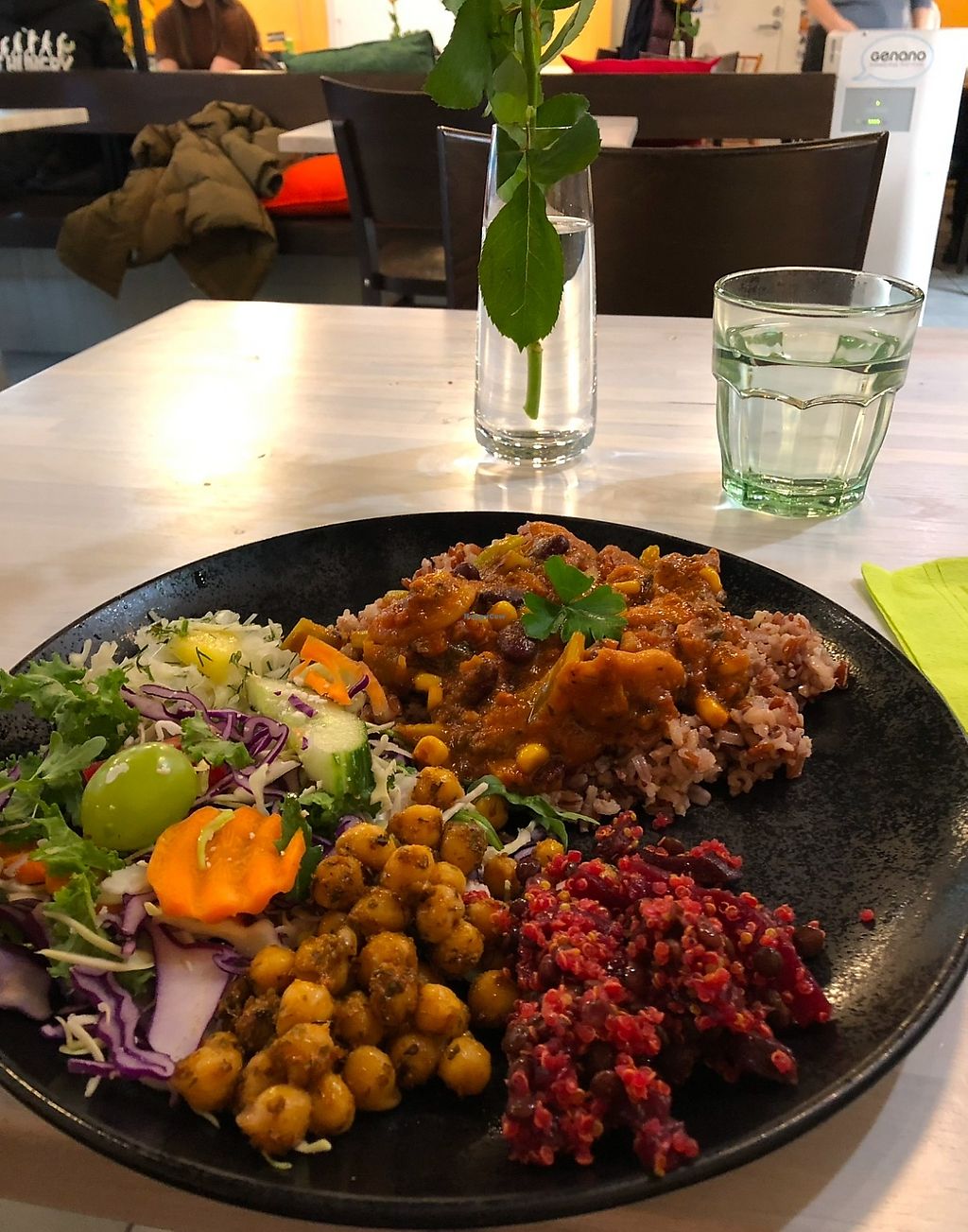 Right in the center of Tapiola´s shopping area (Ainoa) and easy to find, this vegan & no-waste restaurant offers everyday one warm dish sided with 3-4 salads, and the plate is brought to the table.