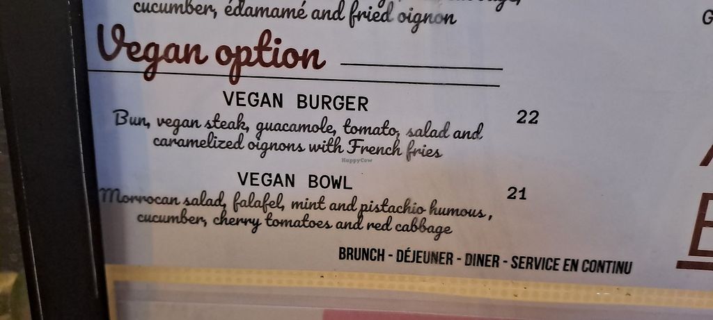 I had the vegan burger (20€) and sparkling water (5€). It is a pricy place but the food was really good and a big portion too. They also had a vegan bowl but no other vegan dishes.