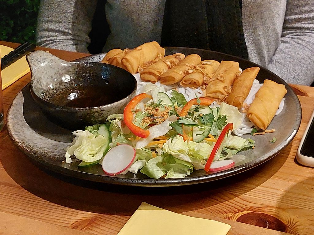 Rice noodle salad with spring rolls