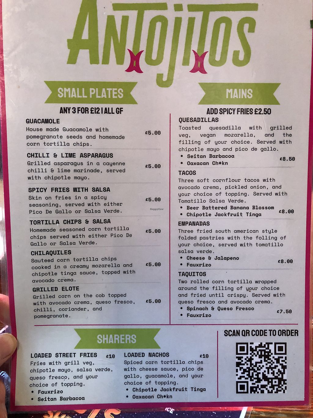 Based in a quirky pub, order food on your phone to your table. Got the vg chicken quesadilla, spicy potatoes & tortilla chips with queso dip. All very tasty!